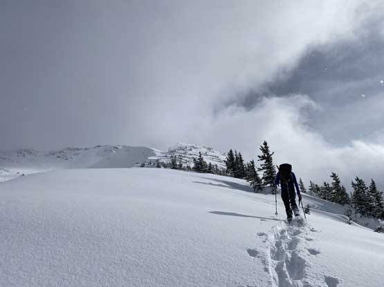 After snapping a few obligatory victory shots we soon headed down, passing the other team on the summit ridge. We wished them luck and continued our descent in the flat light conditions. Once dropping down from the summit ridge the wind died down and it’s time to enjoy the fast plunge on powder. I was very experienced in downhill snowshoeing on powder and was able to make use of all of the soft stuffs. I had a shit ton loads of fun in the forest plunging and jumping the pillows. Having two partners meant I could go more aggressively than soloing. Had I come up here alone I would have to mostly just retrace the tracks to minimize the risk of falling into a weak spot or the consequences of an injury. In about half an hour we had cleared the forest. The plod back across that old road was no fun, nor was the final 8 km numbing plod back to the truck. We all wanted to put our cardio in test and crushed the 8 km hike-out in just over 1 hour and 10 minutes, capping the round trip time in exactly 7 hours.
