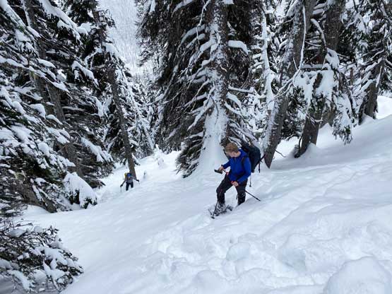 Thank to the previous party’s tracks I decided to use light gears, wearing only “winter hiking boots” and the women’s 25′ snowshoes. I briefly considered short-cutting to hit the logging road but opted to just walk to the standard parking lot. The snowshoes had to be strapped on almost immediately after getting onto the logging road, even though it had seen fair frequent snowmobile and skier’s traffic. For the next 1 hour and 40 minutes we plodded at a fast pace, covering 8 km distance and around 450 m elevation gain. We correctly located the “old logging road” that Al mentioned to me on our Facebook chat, and followed their tracks into the brushes. There was some degree of bushwhacking in alders, but with the tracks nothing was too outrageous, although the fresh snow on the alders did make the going a bit annoying. It seemed to me that Al’s group was confused about where exactly to leave the road judging by the meandering tracks they made. For us however, all we needed was to just follow. There’s no need to add more confusion by finding our own route. The next 400 vertical meters in the forest was as steep as I was expecting, but again due to the tracks our task was easy. We gained elevation on a rapid pace and in short time we arrived at the treeline and decided to take our first, and the only break of the ascent.