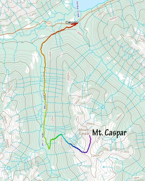 Mt. Caspar forms a long ridge that runs north-south on the Caspar-Van Horlick Divide just to the east of the Joffre Group – the mountaineering central of the Duffey zone near Pemberton, B.C. Mt. Caspar itself seldom draws attention from the mountaineers as the routes are dull and the approach involves a long walk on a logging road as well as fair amount of bushwhacking in summer. There are several routes recommended for ski ascents but one still needs to face that long approach on logging road as well as the steep forest. My plan was to ascend the ski route on snowshoes but given the steep grunt in the woods I wanted to have partners sharing the suffering.