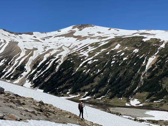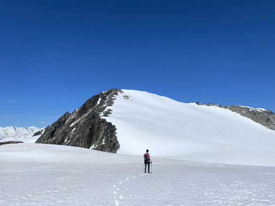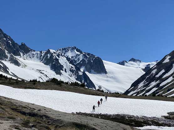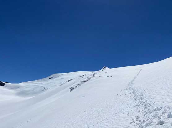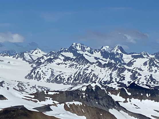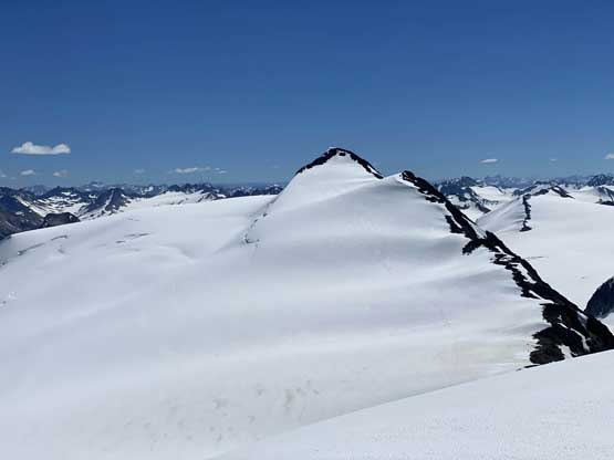 Again we didn’t linger long on the summit because the views were somewhat similar to what we had just seen and the heat’s really taken a toll on us. For the descent we opted to stay relatively on the edge of the glacier and that involved traversing some steep-ish snow. We also took a few long glissades to ease things off and got down in no time. While traversing back to camp we stayed a little higher than on the way in and our round trip time was about 9 hours for the three peaks from camp to camp.