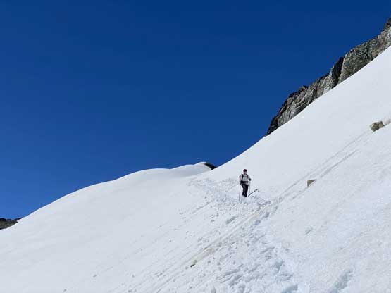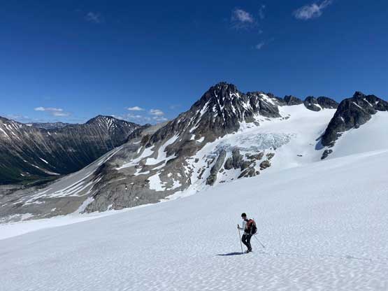 Another photo of Brayden descending the glacier with Athelney Pass ahead