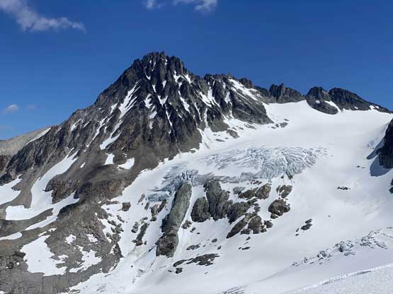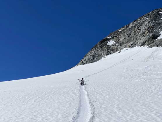 Again we didn’t linger long on the summit because the views were somewhat similar to what we had just seen and the heat’s really taken a toll on us. For the descent we opted to stay relatively on the edge of the glacier and that involved traversing some steep-ish snow. We also took a few long glissades to ease things off and got down in no time. While traversing back to camp we stayed a little higher than on the way in and our round trip time was about 9 hours for the three peaks from camp to camp.