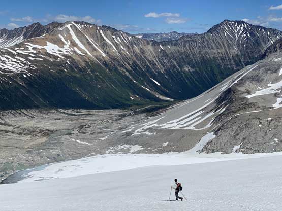 Another photo of Brayden descending the glacier with Athelney Pass ahead