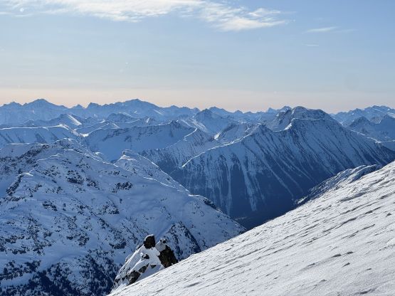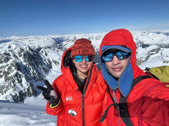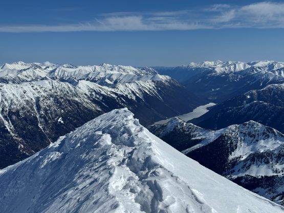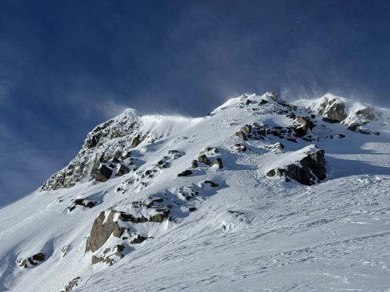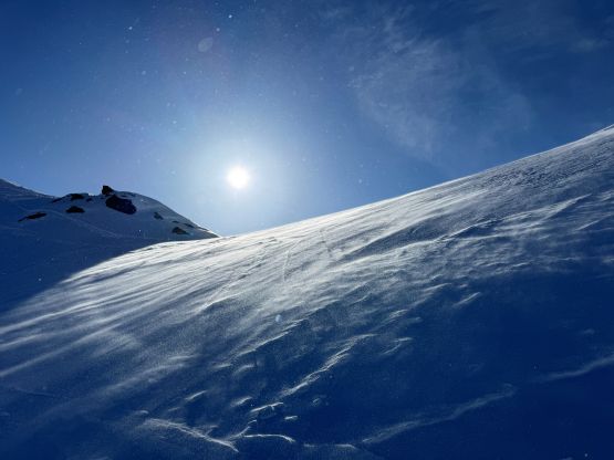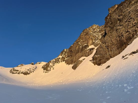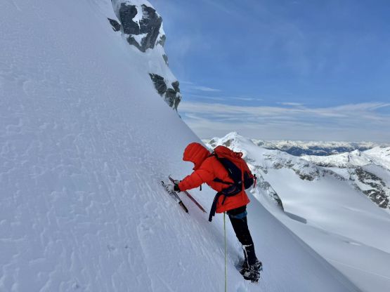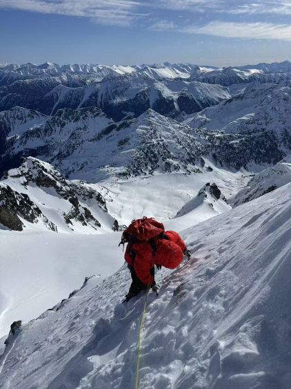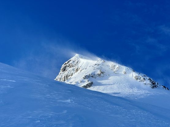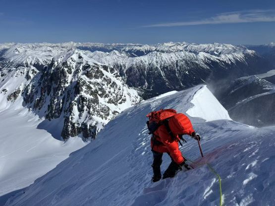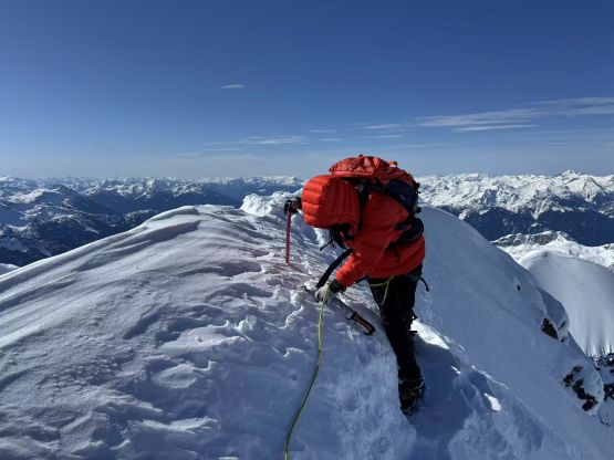We didn’t stop for too long as I had promised Clair that we would stay upfront, and the skiers were quickly closing in the gap. The winds were indeed very annoying, and I started to regret for only wearing my “spring” layering system. This decision had made my climb extremely miserable, but that’s fine as I did this climb for Clair. I also made the spontaneous decision to take a variation up the NE spur instead of the standard north face route, as I was able to spot a set of tracks on the ridge and I thought this route would be more fun. It’s slightly more involved but at least I got to see some different aspects of this objective. Clair was unsure about the climb upon seeing the difficulties so I decided to short-rope her up the final 200 m climb, after taking out the ice tools and swapping snowshoes for the crampons. I would NOT short-rope anyone else in this kind of fashion as this technique would only increase the chance of survival for the second, by decreasing the chance of survival for the leader (me). In any case I made Clair to be only a few meters behind myself, and I told her to keep the rope tight at all time. The winds might actually have done something good, as they were miserable enough for Clair to only focus on the immediate steps ahead. After the initial mixed-ish section we had to climb/traverse a long stretch of ridge before merging onto the standard route at around the 45+ degree face underneath the summit ridge. The final traverse to the true summit was more involved than in January due to the massive cornices. The cornices forced us to traverse on the side on some steeper slopes, and the exposure was severe. A fall by any of us here would be death for both, so I trusted Clair to not make a mistake.