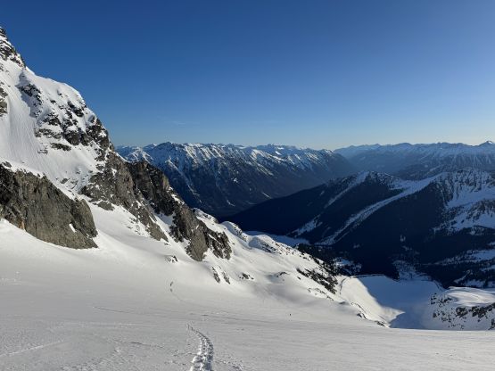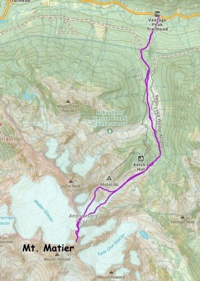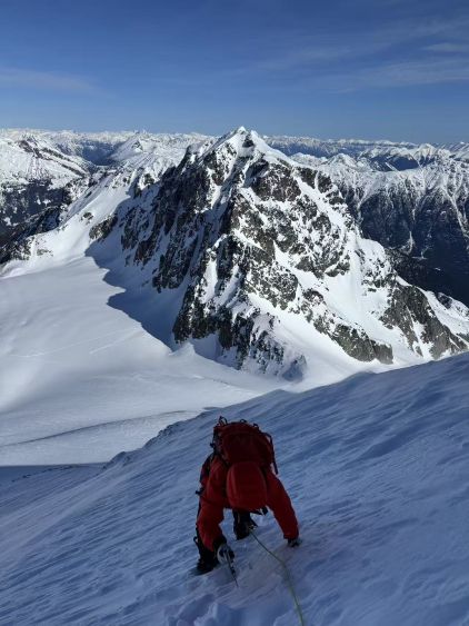 The celebration on the summit was short-lived as we must stay focused on getting off the mountain safely. The skiers were attempting Joffre Peak and at least one party was on Mt. Hartzell, and more skiers were coming up from Matier Glacier side towards Mt. Matier. We crossed path with at least 5 skiers while down-climbing the face. I thought perhaps I would have to lower Clair down on stretch after stretch of 30 m length but she actually did excellently on the facing-in down-climb, even though this was basically her first steep snow climb on crampons. I unfortunately had gotten very cold after embracing the winds for several hours, as the overall pace on the technical terrain was only one third of what I could normally do, but the mistake of not bringing enough layers was on my side. I led us descending a variation route by avoiding that mixed section, but had to add a long stretch of 45-degree traverse to retrieve our ditched gears. For the descent down to Matier/Joffre saddle and the subsequent descent down Anniversary Glacier Clair decided to glissade for as much as possible. I opted to stay on my feet because of the foot injury. Lower down we made the spontaneous decision to descend the entire course of Anniversary Glacier simply because I wanted to see something different this time. Nearing the toe of the glacier Clair had lost one of her snowshoes somehow, but thankfully I was able to retrieve the lost one after plodding back up for only 200 m. I had no idea how people were able to keep plodding without noticing a snowshoe being lost, as this had happened to at least 4 or 5 of my partners. The rest of the descent was uneventful but tiring, and our round trip time was under 11.5 hours.
