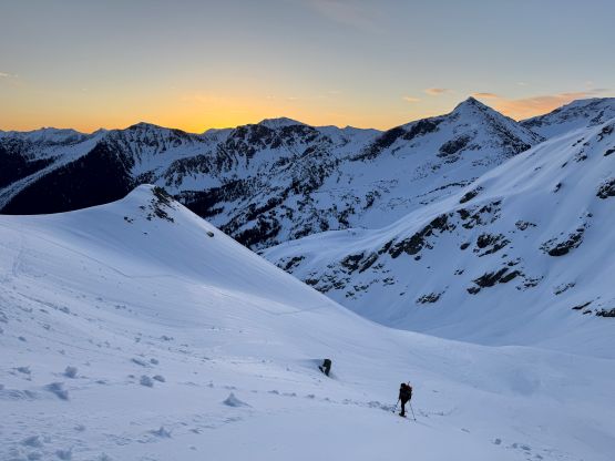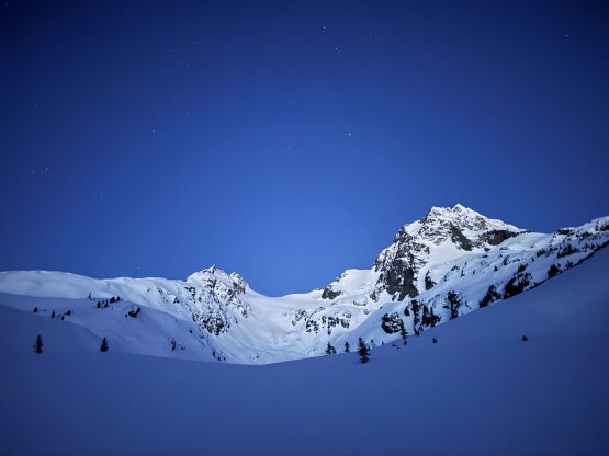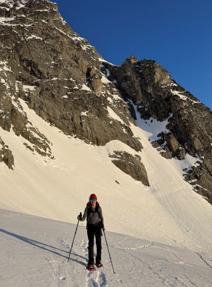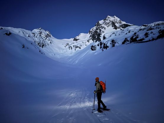 The Cerise Creek approach had also changed significantly since 2016 as a catastrophic landslide happened on Joffre Peak’s NE Face had erased at least 1/3 of the valley. For that reason I actually downloaded my own GPX track in addition to several other tracks posted on peakbagger.com. It seemed like people had gone multiple ways nowadays but the standard route was still the one that I used back in 2016, that was to follow the summer route. The “sketchy bridge” at the beginning was not sketchy at all as it was completely free of snow and was not slippery nor wet. About 100 m of steady elevation gain later we merged onto an old logging road with some undulating grades. We then merged into the erased section of the valley but the travel was still fairly easy following the skin tracks. Clair was able to stay on microspikes for the entire way to the toe of Anniversary Glacier. I, on the other hand, did not bring microspikes so opted to use the snowshoes for the added traction. The head of the valley was trickier than what I remembered probably because of the timing of the year’s different. There was fair amount of steep side-hilling on either side of the creek that my injured ankle did not like. I also thought Clair was doing great as the approach pace was faster than I thought. It was still in pitch dark when we got to the toe of the glacier. I had opted to take the “toe of the glacier” variation instead of traversing to Keith Hut and/or Motel 66, as this route involved the least amount of side-hilling.