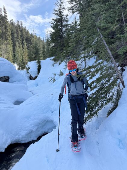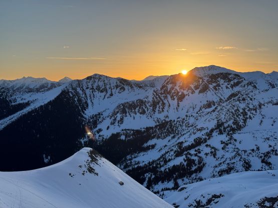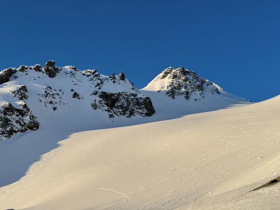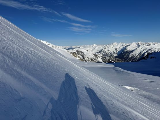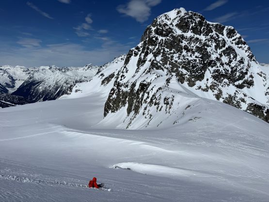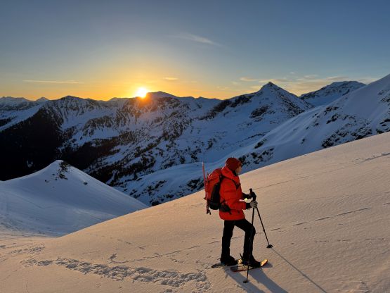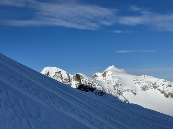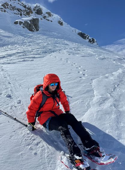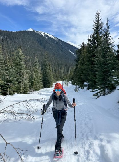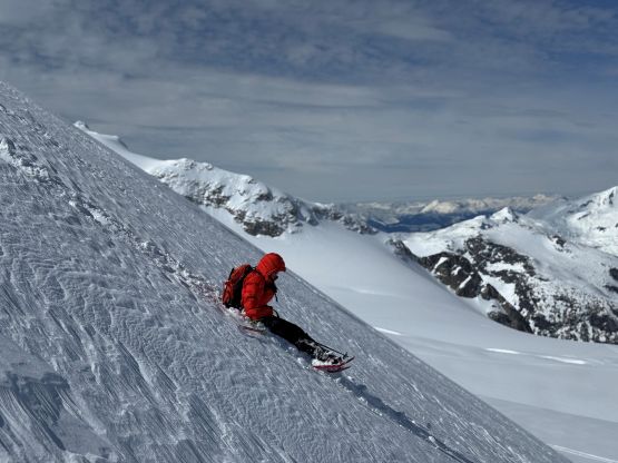 Higher up I decided to take the same route that I used for Joffre Peak back in 2016, that was to take a sharp turn climber’s right aiming at the higher traverse above Motel 66. In retrospect we could have taken the far climber’s left variation straight up the entire course of the glacier to Matier/Joffre saddle, as we descended later in the day. That sharp climber’s right turn involved a section of steep snowshoeing that I could not recall from 9 years ago, and it’s likely due to glacial recession. There were two vehicles parked at the trail-head, and shortly after the sunrise we witnessed 5 skiers ascending behind us. They had likely overnighted in Keith Hut. I told Clair that we were doing great on time, and we would not let those skiers catch up. One thing I failed to understand was, despite the influence of myself and the “SW BC Peakbaggers” group we could not see a single other team on snowshoes, nor any existing set of snowshoe tracks. Following the skin tracks would surely help the trail-breaking, but I preferred to make our own track by aiming straight up the slope towards the saddle. This added the trail-breaking work for myself and I even called for a break roughly 100 m under the saddle. I had also witnessed some significant amount of wind transportation on the higher elevation, so it made more sense to take an energy break here than in the cold winds higher up.