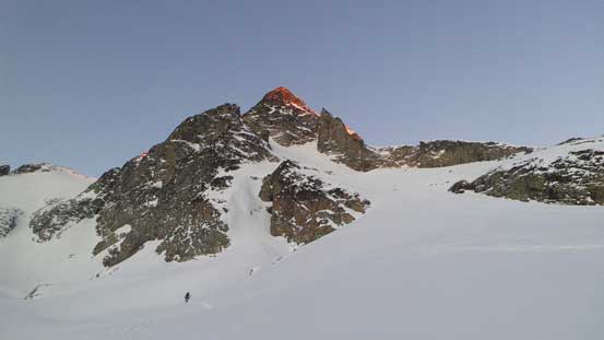 Ascending through another depression zone beneath Joffre’s cliff faces we cut over to the upper Anniversary Glacier. The glacier plod was as easy as expected, although fairly foreshortening. I was initially planing to take an energy break at Joffre/Matier col but a strong gust welcomed us forcing us to put layers on and keep going. The lower Matier’s slope involved lots of wind affected hardpacked/icy snow which made some challenging skinning. A major crevasse was easily bypassed and we skin’d to as far as we “wanted” before switching to boot-packing.