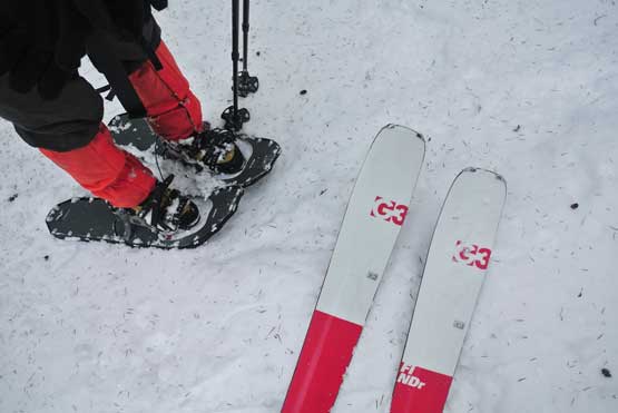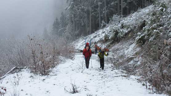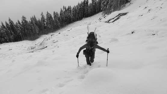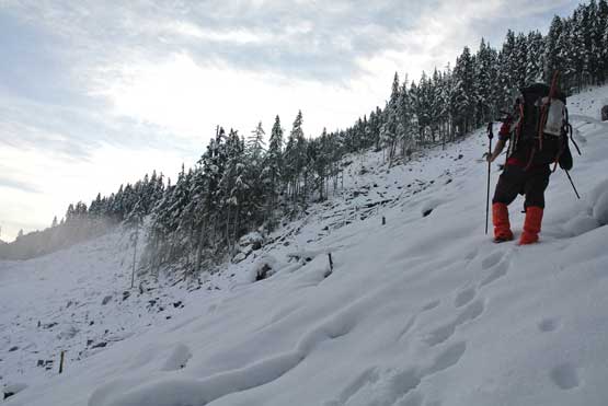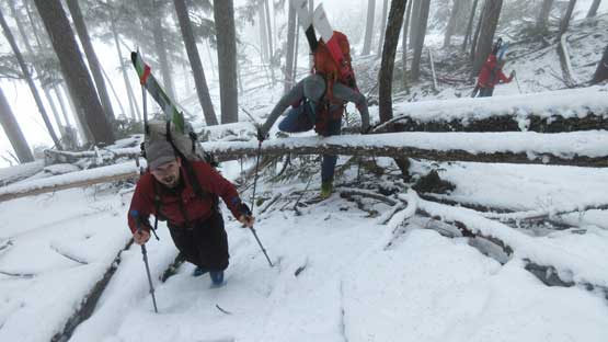 As typical as BC adventures go we again started by walking up the road. Fallen boulders and large patches of ice indicated we did make a good call for parking lower down. It’s worth noting that the satellite images on Google Earth are outdated. The spur roads now climb to about 850 m elevation and the last two switchbacks weren’t shown on the map. As a result we entered the forest too early. For about 200 m elevation gain the travel was painful with plenty of deadfalls and that’s especially true on this sustained incline with overnight packs plus skis/snowshoes. After a while we got out of the forest and ascended the edge of a semi-covered cutblock which was a little bit better, but not by much. The bushwhacking was replaced by post-holing and that’s it. Above the cutblock we then had to climb a short, but very steep bluffy section before finally donning snowshoes and skis. The next 200 m elevation gain wasn’t much better neither with still lots of deadfalls to negotiate. Pain in the ass on skis but not too bad on snowshoes.