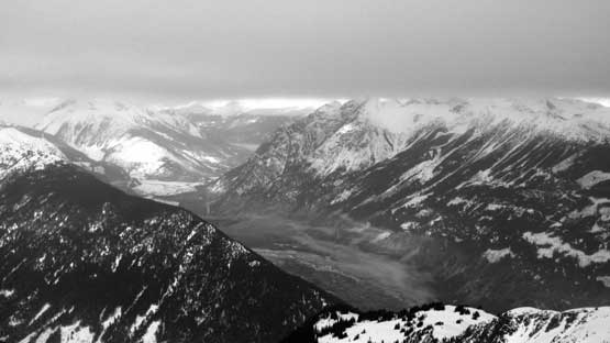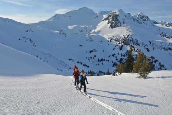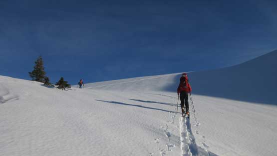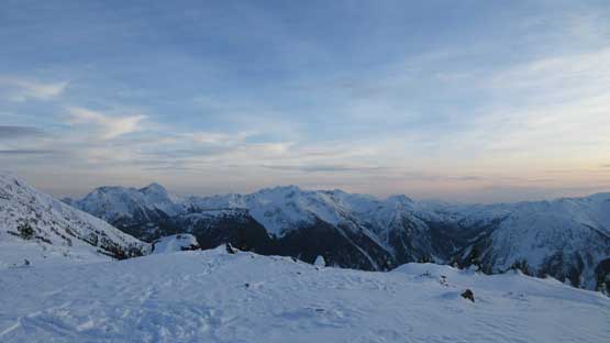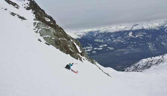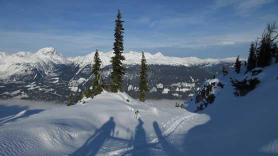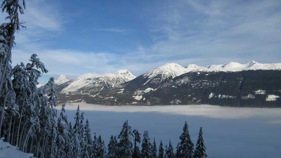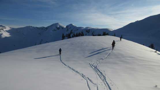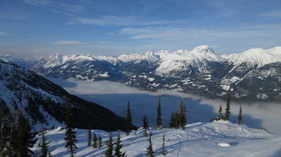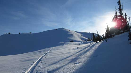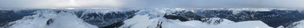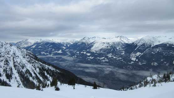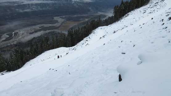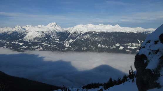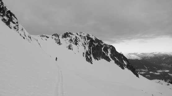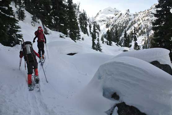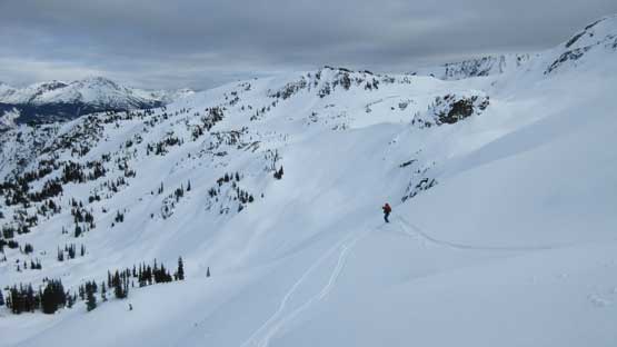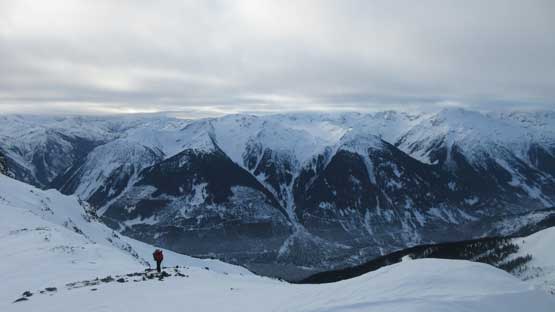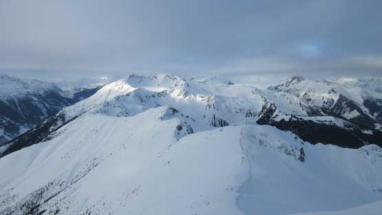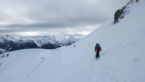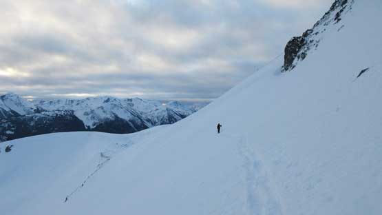 The general bearing was shooting straight up this forested slope which essentially just a truncated spur on the side of the main U-shaped Upper Lillooet Valley. The grade was very sustained with no rest break whatsoever, thrown in a few very steep rolls just for more fun. The only good thing – the snow depth did increase gradually. About 2/3 of the way up this forested grunt the other skiers eventually caught up and took over the lead. The post-holing really slowed me down but on skis they did have a better flotation. I was struggling for a while as following their skin tracks I still sank occasionally plus I had to deal with the constant side-hilling travel, but if going straight up I’d have to break my own trail entirely. I ended up taking the combined method of two. Upwards, onwards and repeat… Near treeline we had to ascend a stretch of 40 degree forest and thankfully it’s the skier’s turn to struggle now.. We traversed out to the right and then there came the treeline zone – about 300 m gain on steep bluffy zig-zagging path to eventually crest the ridge. This area sucked a big time. Apart from the steepness we did’t have enough snow to fully covered the boulders.