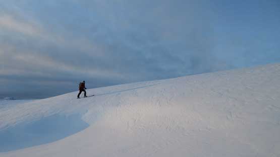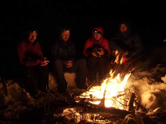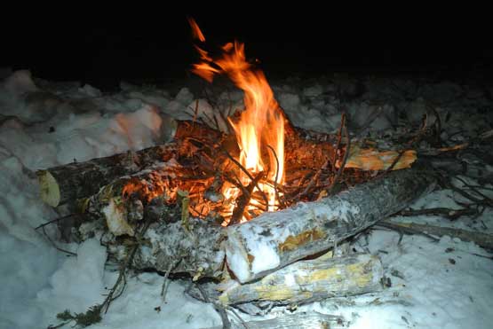 By now we had put behind more than one vertical mile of elevation gain. The weather cooperated with not much wind although there were high clouds rolling in from the west. The main highlight was making a fire on snow. Daniel even came prepared with a handsaw and we did find dead trees on the south side of the ridge. After a few trips back and force we got plenty of woods to keep a big fire up for a few hours and it surely did not disappoint us. It kept going until past 9 pm and then we figured it’s probably a good idea to at least catch a few hours of sleep…