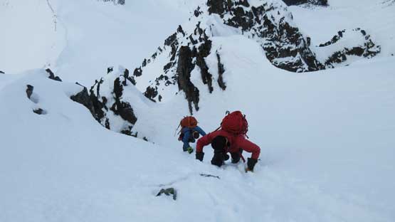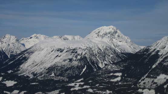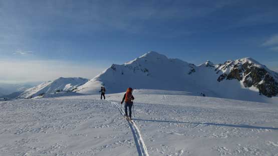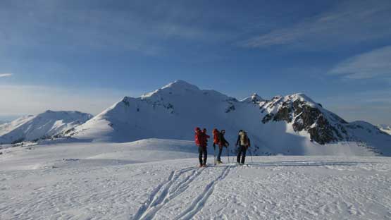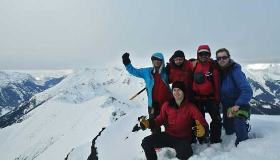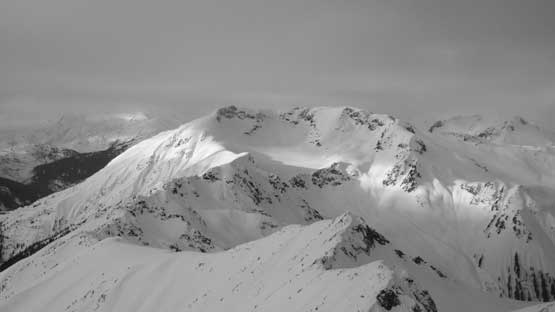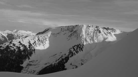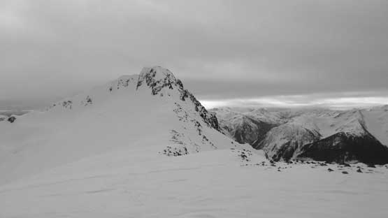 Onto the SE Ridge the next task was simply following this wind scoured ridge to the base of the summit block. There’s just enough snow to keep the snowshoes and skis on so we didn’t have to bootpack. The summit block appeared tricky and it sure was, to a certain extend of course. I could spot two possible lines but decided to check out the south side first. And once around I spotted a neat couloir. At this point I didn’t know whether or not this couloir would go but climbed it nonetheless. It steepens to about 45 degrees at the top and guess what. It dumped us right on the summit so not bad, not bad.. The summit celebration was short as we still had a long ways to go.