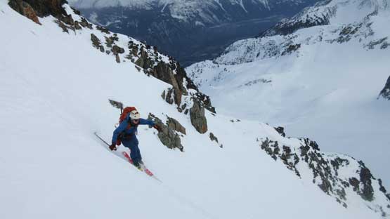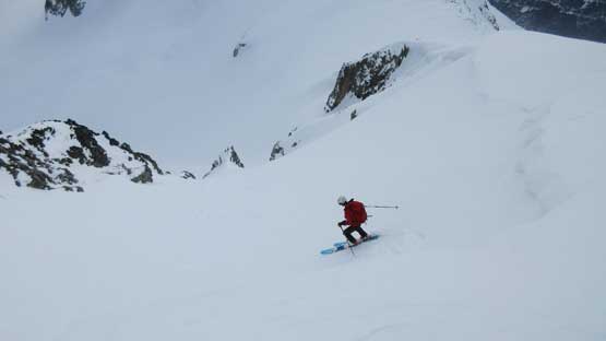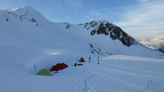 Down-climbing the couloir was easy and fun and then the skiers decided to take a steep line off the east face. I like down-climbing steep snow so opted to follow anyway. The top 20 meters was done by facing in and after a while the grade mellowed out so I could plunge down facing outwards. Near the bottom I even opted for a long glissade which was very fun. The rest of the descent down that north glacier was a fast plunge but then re-ascending back to the “high shoulder” was a grunt. By now the snow had become soft and sticky. It seemed like I wasn’t the only one having that balling problem so nobody was having fun. The run back to camp was so-so and then we spent another half an hour breaking camp. As always the crux was to dig those pegs out (t-slot anchors).