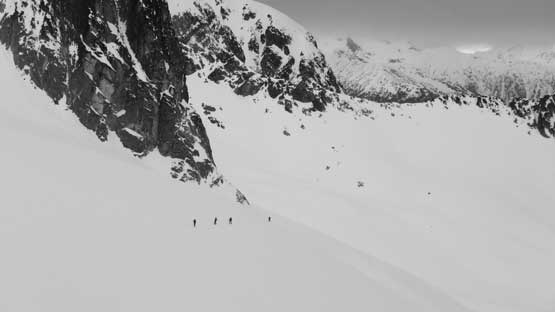 The morning of Day 2 we woke up a bit later than planned. Lots of high and middle clouds were rolling in just as forecasted but at least our peak was still clear, so off we went. There are quite a few ways we discussed and we eventually picked the “middle route”. The first aim was a “high col” immediately to the right of a sub-summit. It looked pretty steep to get up there but actually not too bad. About 35 degrees at the maximum and we all managed to skin up. I simply followed behind on snowshoes while ruining the skin tracks. The second stage was losing about 100 m elevation on the north side glaciers to contour around a buttress feature. Easy peasy. And the third stage was re-ascending all the way to the SE Ridge of Mt. Morrison and this was again, done on the north glacier.