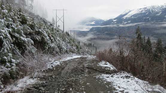 With the plan solidly set we all managed to squeeze into my Tacoma with the gears all dumped on the truck’s bed by 5:30 am. The drive to Pemberton was uneventful and then we turned left. After about 20 kilometers down the Pemby Valley the road turns gravel which marks the start of Lillooet South FSR. The short spur road that we used to access Mt. Morrison isn’t even marked on bivouac.com, but fairly obvious once we got there (BR 200). It’s hard to count on being able to get far on this BR 200 but the spur was in a surprisingly good shape although I did bottom the truck out once. Eventually after two turns we parked at roughly 420 m elevation. The road was still fine but we started encountering frost and ice such that without winter tires nor chains it seemed dumb to push any further.