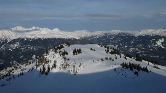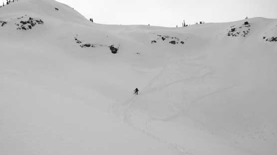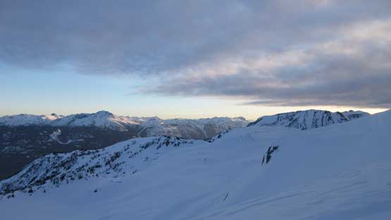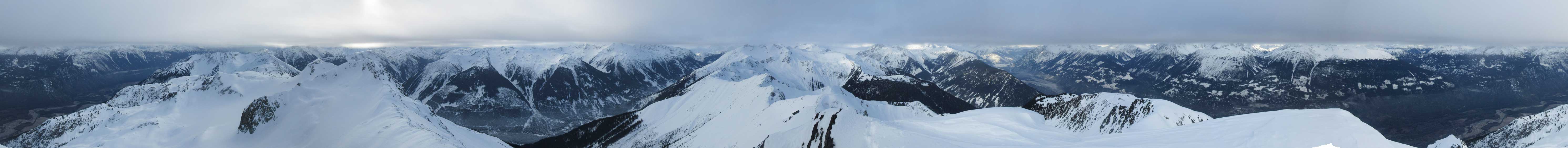 The general bearing was shooting straight up this forested slope which essentially just a truncated spur on the side of the main U-shaped Upper Lillooet Valley. The grade was very sustained with no rest break whatsoever, thrown in a few very steep rolls just for more fun. The only good thing – the snow depth did increase gradually. About 2/3 of the way up this forested grunt the other skiers eventually caught up and took over the lead. The post-holing really slowed me down but on skis they did have a better flotation. I was struggling for a while as following their skin tracks I still sank occasionally plus I had to deal with the constant side-hilling travel, but if going straight up I’d have to break my own trail entirely. I ended up taking the combined method of two. Upwards, onwards and repeat… Near treeline we had to ascend a stretch of 40 degree forest and thankfully it’s the skier’s turn to struggle now.. We traversed out to the right and then there came the treeline zone – about 300 m gain on steep bluffy zig-zagging path to eventually crest the ridge. This area sucked a big time. Apart from the steepness we did’t have enough snow to fully covered the boulders.