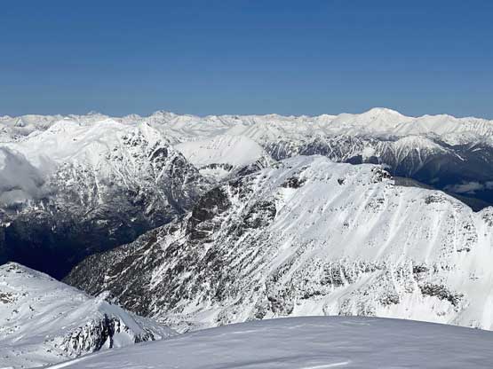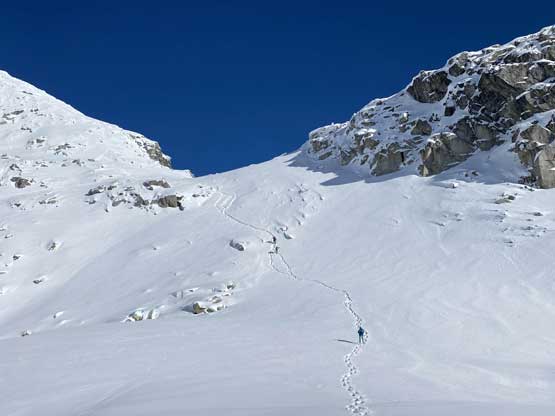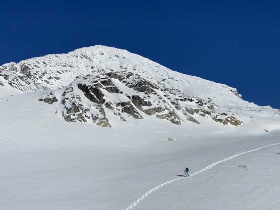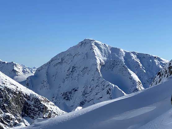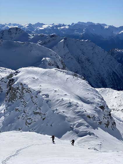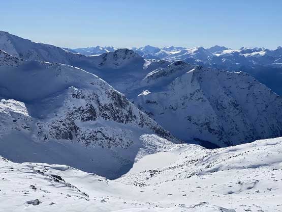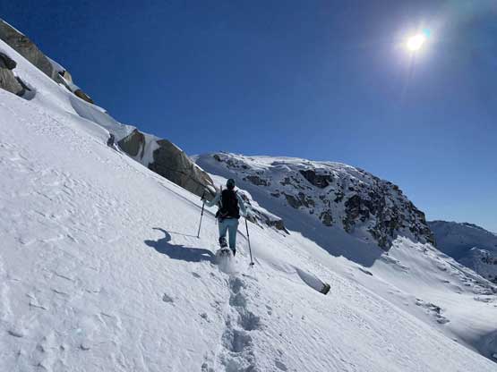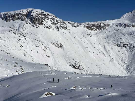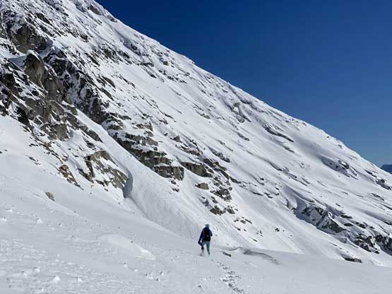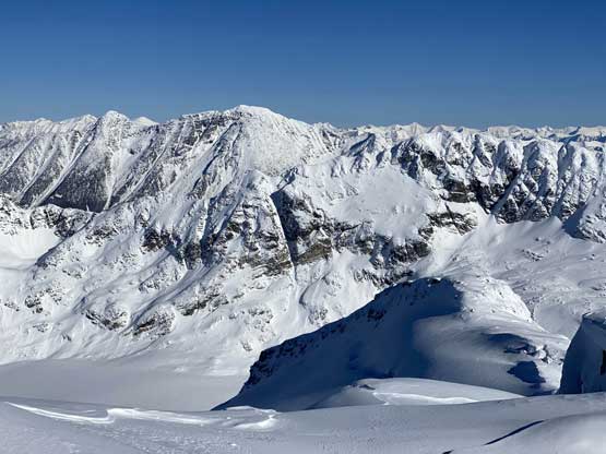 On the descent I took the snowshoes off and went for a long glissade, losing over 100 m down the south slopes to below Olds/White col. The others kept their snowshoes on and also glissaded here and there. I thought about to tag “White Peak” as it’s right there, but I do not like unofficial names especially the ones given by bivouac.com. We faced a major decision at this point because the most obvious way was to plod back up and over Mt. Oleg and that involved about 300 m of elevation regain. I did have another route in mind but such was unknown. I’m never a fan of trying an unknown descent route just for the sake of making a loop, but this time I convinced myself that was okay because I too was tired of thinking to re-ascend Mt. Oleg. We then descended further down into the bowl under Mt. Oleg and Mt. Olds and then re-ascended about 100 m to the “south col” of Mt. Oleg. To continue descending all the way down from our bowl would be ideal on paper, but that was the route Simon and Vlad took in 2018. I knew their trip report and I certainly did not want to taste the worst devil’s club bushwhacking on this particular day. Our planned route likely also involved a hell deal of pick-up-sticks but I preferred that over the thorny stuffs.