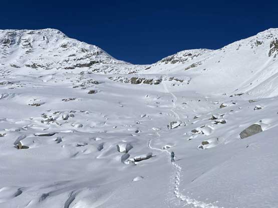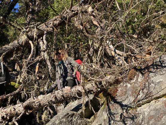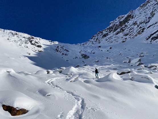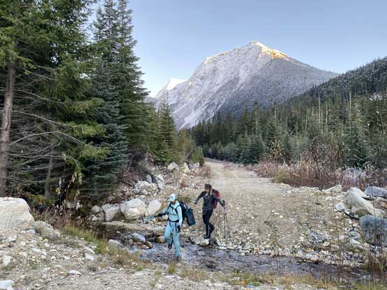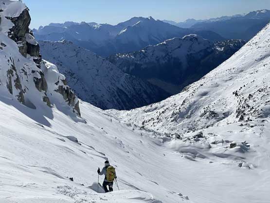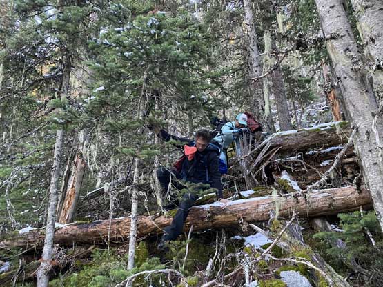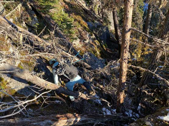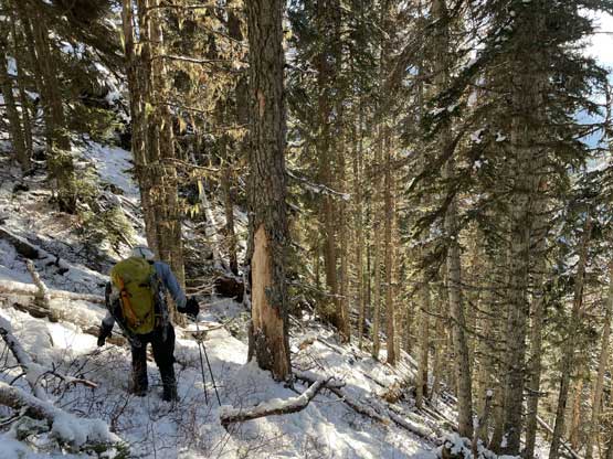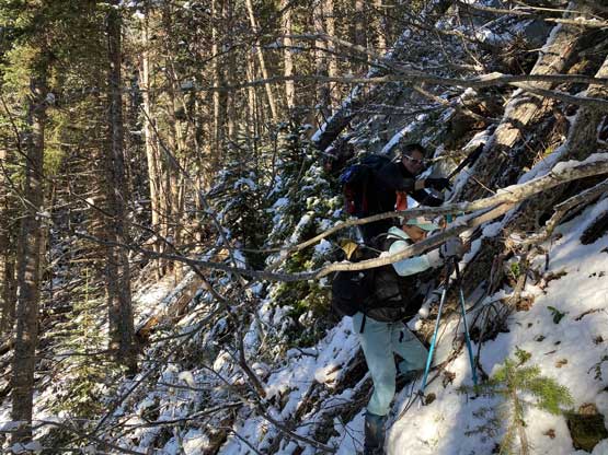 Descending west of Mt. Oleg’s south col we had a zone of cruising. The closer contour lines on the map suggested a possible cliff but luckily we found the far skier’s left offering a trouble-free passage. The next long plunge got us to below 2000 m and the snowpack had thinned enough that the boulders started to reveal from underneath. For the next few hundred meters of descent we had no choice but to snowshoe on thinly covered boulders. That was a tad sketchy to say the least, but thankfully I did have fair amount of experience of this. At times I led us bailing into the forest on skier’s right side and the going was sometimes better. We kept the snowshoes all the way down to around 1800 m, lower than where we strapped them on in the morning. We mostly followed the course of the creek at this point. The forest had moderate underbrush but mostly free of pick-up-sticks.