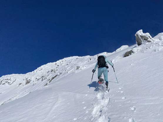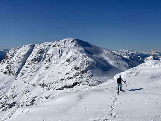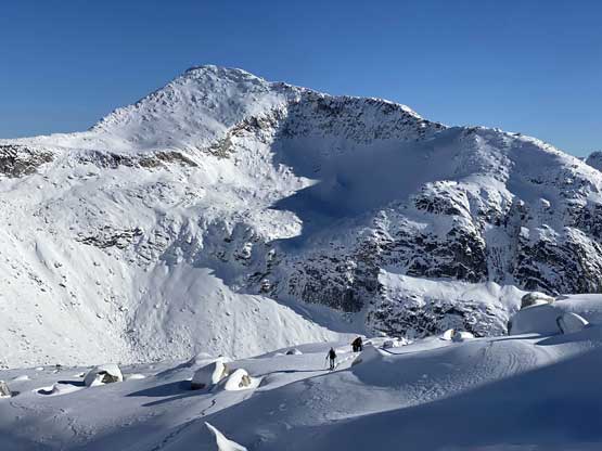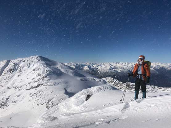 The steep slope immediately under Oleg/Olds col was a bit shallow but we all managed to descend with snowshoes attached to our feet. Mel and I then plodded ahead to firstly descend into a bowl then cut a side-hill traversing line to access Olds/White col. From the col the ascent of Mt. Olds was nothing but a steep grunt on snowshoes. The winds were hammering the slope and the condition was decently firm to allow fast travel on snowshoes. The slope was considerably steeper than the ones on Mt. Oleg.