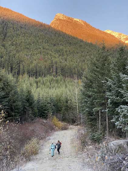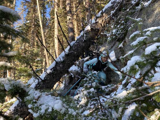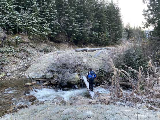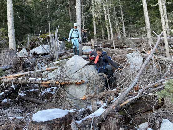 I thought about to just bash out of this creek but following a creek usually turned out to be a disastrous idea in the Coast Ranges so I quickly abandoned that thought. At about 1700 m I found a reasonable spot to cross the creek (side-hill bash through snow-covered alders) then tried really hard to maintain a descending traverse out towards down-climber’s left. The terrain always wanted to suck us rightward into the creek and every time I checked the GPS I told myself to traverse farther left. Unfortunately we never did traverse far enough such that we got sucked into some insanely steep slopes around 1500 m. We must traverse hard left across some no-fall zones with lots of pick-up-sticks to negotiate. We then did manage to find some cruising in the forest with much better pick-up-sticks situation than the forested rib we used in the morning, but at 1350 m we encountered a bluff that was impossible to descend without a rope. We were forced to traverse about 200 meters farther to the down-climber’s left (east) until finding a reasonable spot to descend through that bluff. At this point we were only 100 vertical meters above the logging cut-block but this 100 m involved a greater deal of pick-up-sticks that even downhill direction did not help much. We had to keep our spirit high and maintain the perseverance and eventually we got out of the trees and down to the road. The rest of the road-slog was such a refreshment and we got back to the truck just moments before sunset.