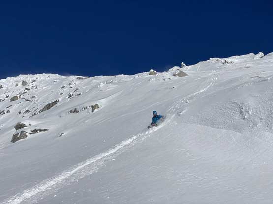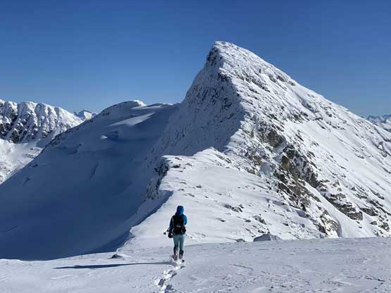 The steep slope immediately under Oleg/Olds col was a bit shallow but we all managed to descend with snowshoes attached to our feet. Mel and I then plodded ahead to firstly descend into a bowl then cut a side-hill traversing line to access Olds/White col. From the col the ascent of Mt. Olds was nothing but a steep grunt on snowshoes. The winds were hammering the slope and the condition was decently firm to allow fast travel on snowshoes. The slope was considerably steeper than the ones on Mt. Oleg.