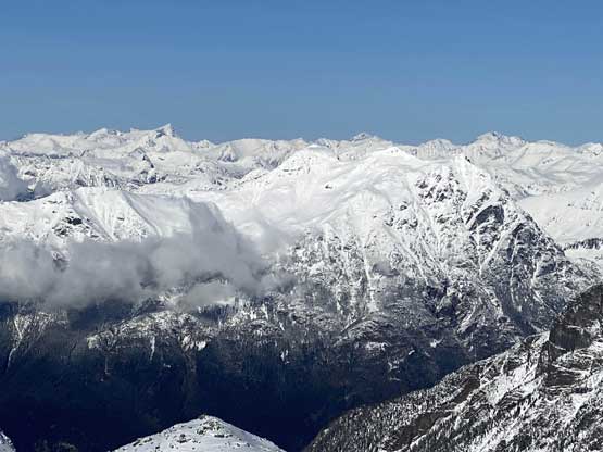 On the descent I took the snowshoes off and went for a long glissade, losing over 100 m down the south slopes to below Olds/White col. The others kept their snowshoes on and also glissaded here and there. I thought about to tag “White Peak” as it’s right there, but I do not like unofficial names especially the ones given by bivouac.com. We faced a major decision at this point because the most obvious way was to plod back up and over Mt. Oleg and that involved about 300 m of elevation regain. I did have another route in mind but such was unknown. I’m never a fan of trying an unknown descent route just for the sake of making a loop, but this time I convinced myself that was okay because I too was tired of thinking to re-ascend Mt. Oleg. We then descended further down into the bowl under Mt. Oleg and Mt. Olds and then re-ascended about 100 m to the “south col” of Mt. Oleg. To continue descending all the way down from our bowl would be ideal on paper, but that was the route Simon and Vlad took in 2018. I knew their trip report and I certainly did not want to taste the worst devil’s club bushwhacking on this particular day. Our planned route likely also involved a hell deal of pick-up-sticks but I preferred that over the thorny stuffs.