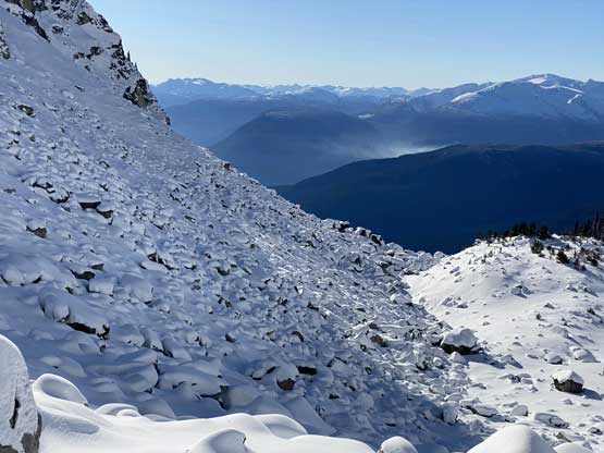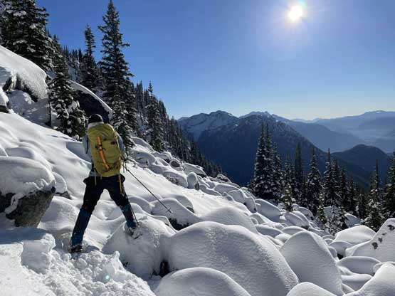 Descending west of Mt. Oleg’s south col we had a zone of cruising. The closer contour lines on the map suggested a possible cliff but luckily we found the far skier’s left offering a trouble-free passage. The next long plunge got us to below 2000 m and the snowpack had thinned enough that the boulders started to reveal from underneath. For the next few hundred meters of descent we had no choice but to snowshoe on thinly covered boulders. That was a tad sketchy to say the least, but thankfully I did have fair amount of experience of this. At times I led us bailing into the forest on skier’s right side and the going was sometimes better. We kept the snowshoes all the way down to around 1800 m, lower than where we strapped them on in the morning. We mostly followed the course of the creek at this point. The forest had moderate underbrush but mostly free of pick-up-sticks.