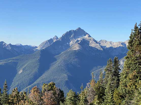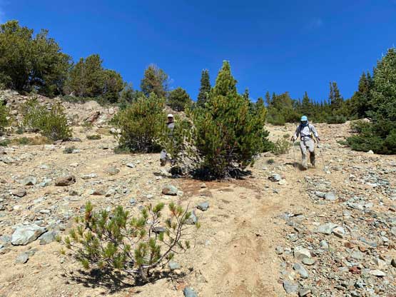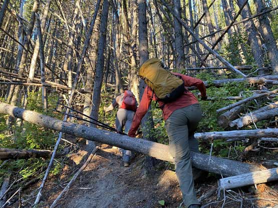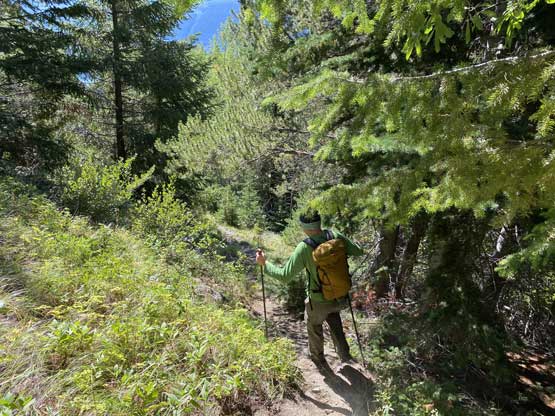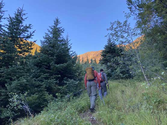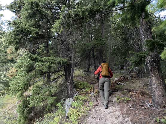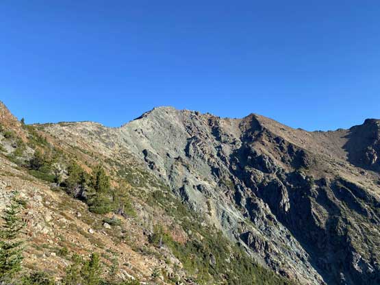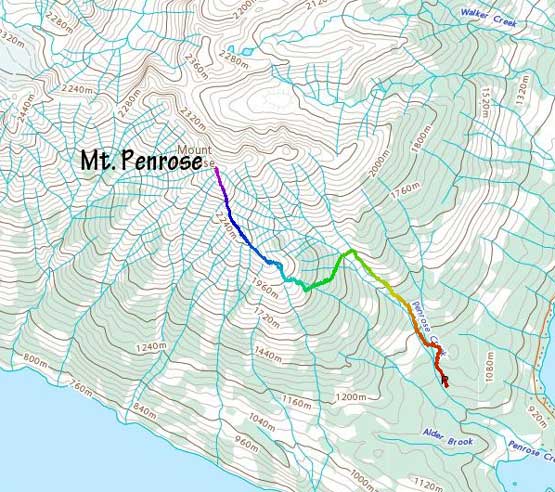 We were concerned about the long drive home after the ascent as both Alex and Vlad had to work on Monday so we shouldn’t get back home too late. We woke up at 5 am in the pitch dark and quickly packed up the tents. The temperature wasn’t as cold as the day before so the tents didn’t get as wet. The drive to the actual trail-head involved about a kilometer of deactivated road with some water bars that required decent clearance. The actual trail-head was just a small pull-out that could only fit a few vehicles. We were the only party on this peak even though it’s a sunny Sunday, so the parking wasn’t a problem. The start of this trail was actually on a deactivated road. The trail paralleled Penrose Creek on the right hand side and we ascended over 500 m elevation before making a hard left-turn to cross the (dry) creek. The trail became increasingly steep and rough after the creek crossing and in no time we had ascended to the treeline zone at near 2000 m. The views were opening up and we took the first break of the day.