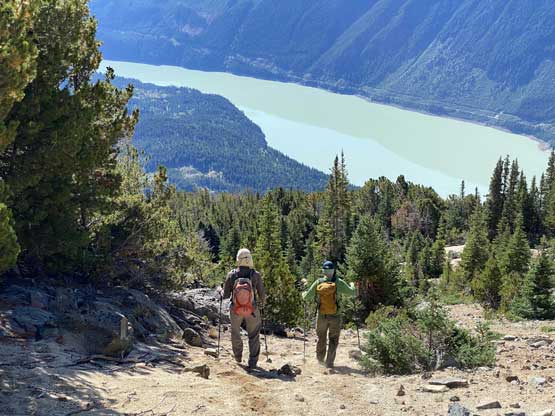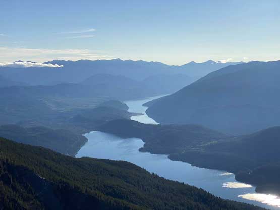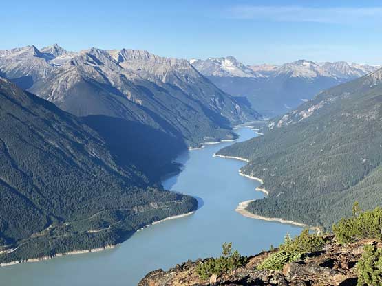 Mt. Penrose is one of those peaks that loom directly above the community of Gold Bridge in Bridge River Valley somewhere deep in the Coast Mountains. This is also one of the easier summits in the area because a trail ascends the southern flanks onto the alpine on the SE Ridge. The scramble along the SE Ridge to the summit was also straightforward with very minimal exposure or hands-on moves. This trail was built by the locals and was kept somewhat secret on the internet in the past, but things had changed in the last few years especially after my friend Adam W. from Washington made an ascent in 2018 with John Stolk and published a GPS track. These days all we needed was to download his GPS track from peakbagger.com and all the mysteries would be resolved. This peak has the potential to become very busy in the near future because it offers some of the finest views of Downton Lake and is relatively easy to ascend. The only drawback is the long drive but let’s face it. Alex, Vlad and I did this same scramble on the second day of our Gold Bridge peak-bagging trip. Earlier in the trip we had ascended Dickson Peak and Mt. Zola and then car-camped not far from Mt. Penrose’s trail-head.