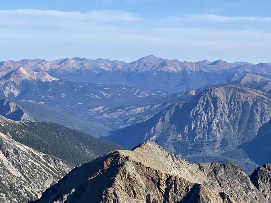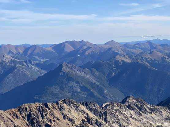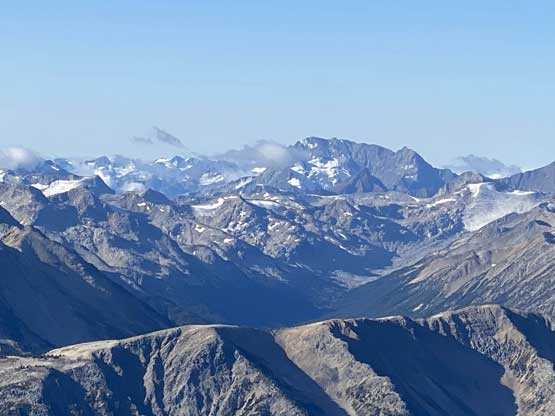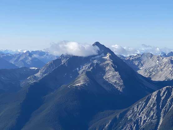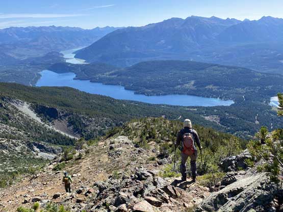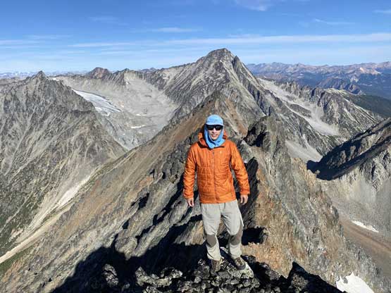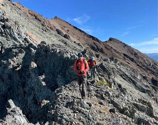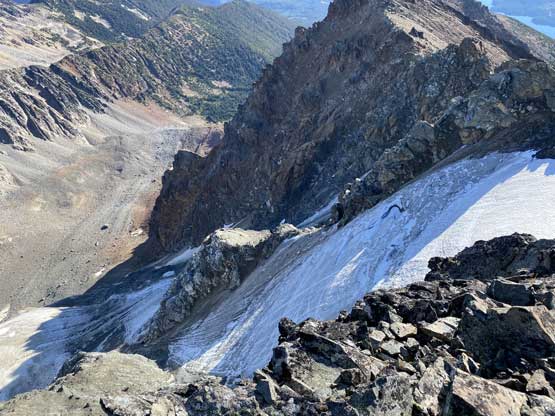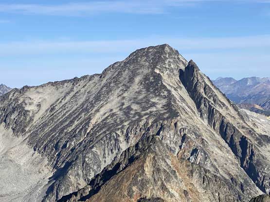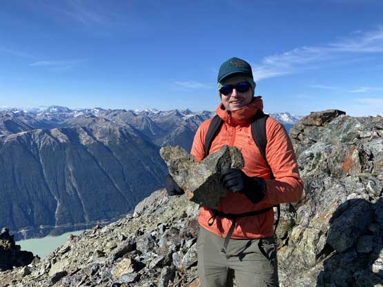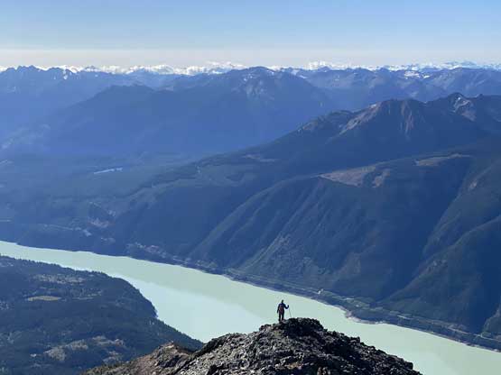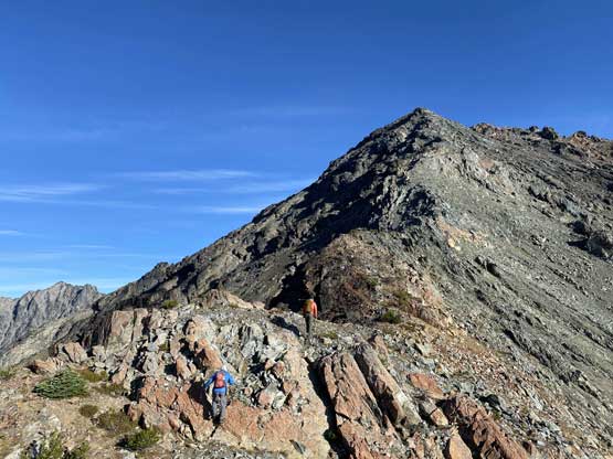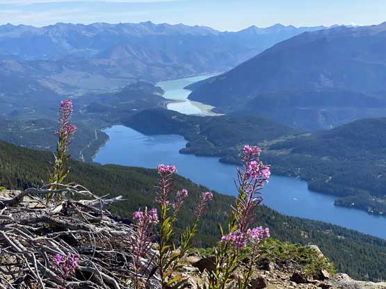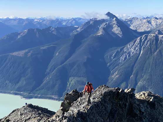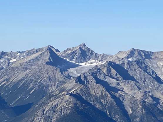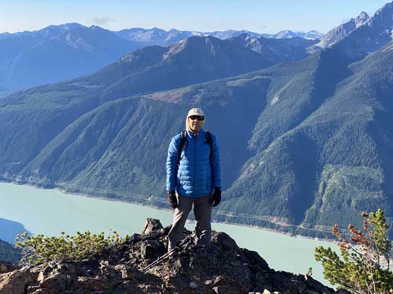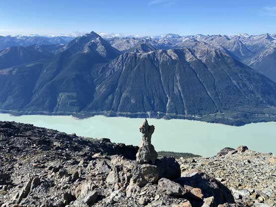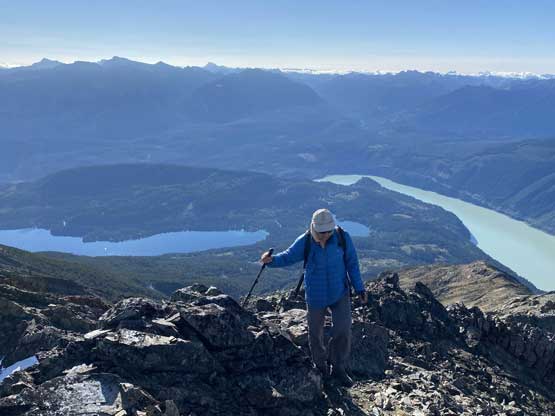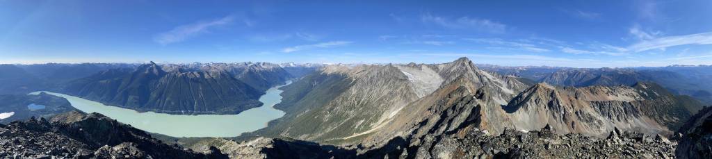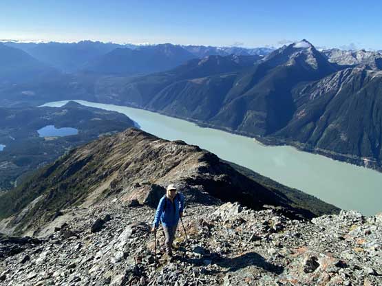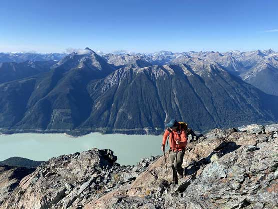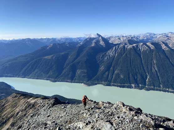 We paid a lot of attention to follow the flagging and the trail took us climber’s left of Adam’s GPS track. At this point it didn’t really matter which way to choose as we were almost onto the ridge anyway. The terrain had a ton of loose sand, painful to ascend but fun to descend a couple hours later. After breaking out of the woods we scrambled onto a subsidiary bump with a weather station (but no cell service). It was here that I ditched the trail runners and swapped footwear for mountaineering boots. For the final 500 m elevation gain we just needed to stay on the crest of the SE Ridge and the scramble was easier than it appeared. The steepest section came about 200 m under the very top where we must deal with a few 3rd class moves on somewhat loose rocks, but as mentioned above there’s no exposure. The entire ascent felt like a slog although the excellent views had diminished the pain factor. I think the view from Mt. Penrose is better than from Dickson Peak because we had unobstructed views of the lakes in Bridge River Valley.