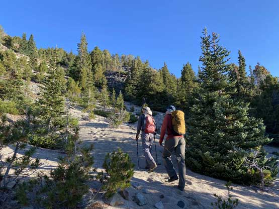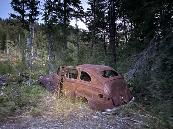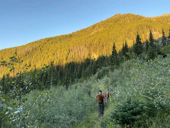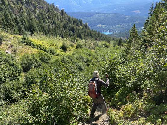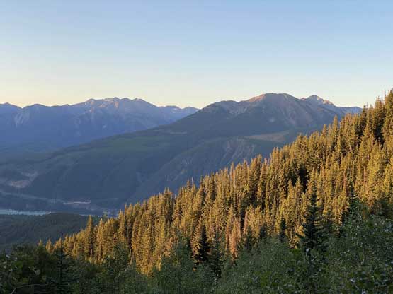 We were concerned about the long drive home after the ascent as both Alex and Vlad had to work on Monday so we shouldn’t get back home too late. We woke up at 5 am in the pitch dark and quickly packed up the tents. The temperature wasn’t as cold as the day before so the tents didn’t get as wet. The drive to the actual trail-head involved about a kilometer of deactivated road with some water bars that required decent clearance. The actual trail-head was just a small pull-out that could only fit a few vehicles. We were the only party on this peak even though it’s a sunny Sunday, so the parking wasn’t a problem. The start of this trail was actually on a deactivated road. The trail paralleled Penrose Creek on the right hand side and we ascended over 500 m elevation before making a hard left-turn to cross the (dry) creek. The trail became increasingly steep and rough after the creek crossing and in no time we had ascended to the treeline zone at near 2000 m. The views were opening up and we took the first break of the day.