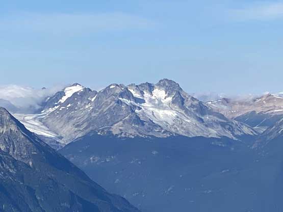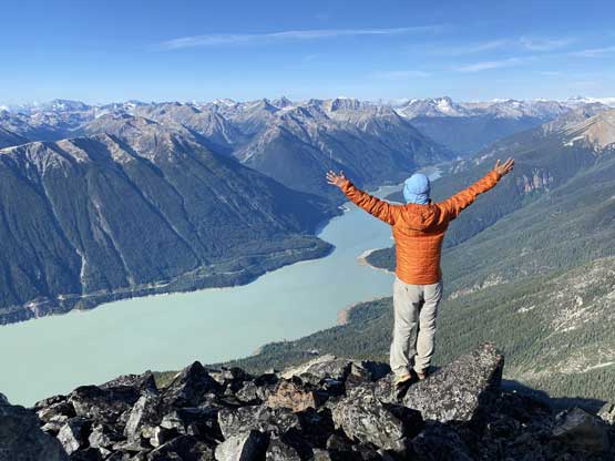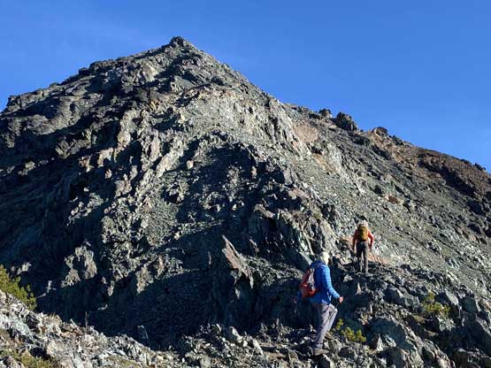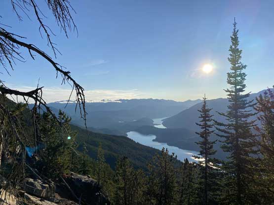 We paid a lot of attention to follow the flagging and the trail took us climber’s left of Adam’s GPS track. At this point it didn’t really matter which way to choose as we were almost onto the ridge anyway. The terrain had a ton of loose sand, painful to ascend but fun to descend a couple hours later. After breaking out of the woods we scrambled onto a subsidiary bump with a weather station (but no cell service). It was here that I ditched the trail runners and swapped footwear for mountaineering boots. For the final 500 m elevation gain we just needed to stay on the crest of the SE Ridge and the scramble was easier than it appeared. The steepest section came about 200 m under the very top where we must deal with a few 3rd class moves on somewhat loose rocks, but as mentioned above there’s no exposure. The entire ascent felt like a slog although the excellent views had diminished the pain factor. I think the view from Mt. Penrose is better than from Dickson Peak because we had unobstructed views of the lakes in Bridge River Valley.