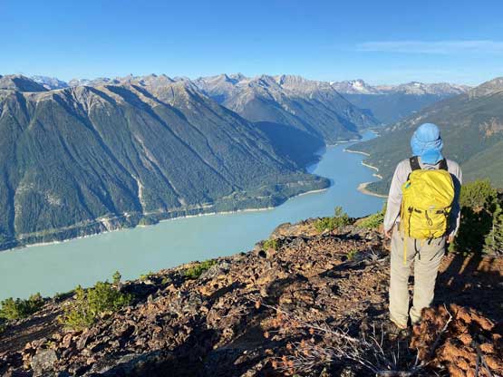 Mt. Penrose is one of those peaks that loom directly above the community of Gold Bridge in Bridge River Valley somewhere deep in the Coast Mountains. This is also one of the easier summits in the area because a trail ascends the southern flanks onto the alpine on the SE Ridge. The scramble along the SE Ridge to the summit was also straightforward with very minimal exposure or hands-on moves. This trail was built by the locals and was kept somewhat secret on the internet in the past, but things had changed in the last few years especially after my friend Adam W. from Washington made an ascent in 2018 with John Stolk and published a GPS track. These days all we needed was to download his GPS track from peakbagger.com and all the mysteries would be resolved. This peak has the potential to become very busy in the near future because it offers some of the finest views of Downton Lake and is relatively easy to ascend. The only drawback is the long drive but let’s face it. Alex, Vlad and I did this same scramble on the second day of our Gold Bridge peak-bagging trip. Earlier in the trip we had ascended Dickson Peak and Mt. Zola and then car-camped not far from Mt. Penrose’s trail-head.