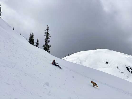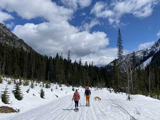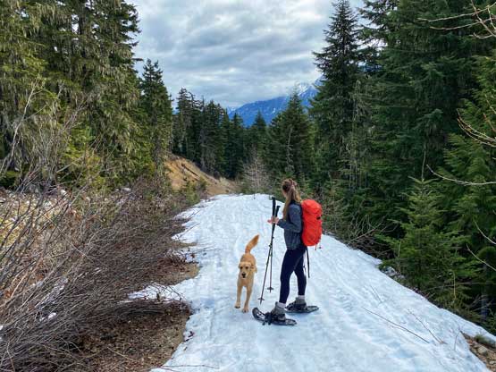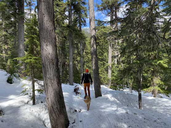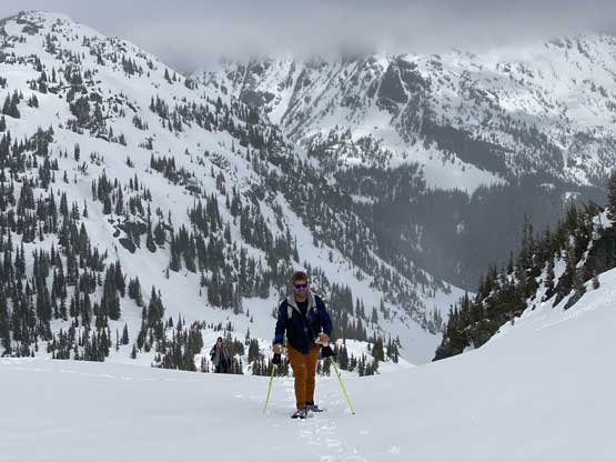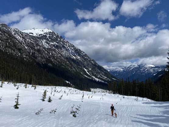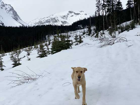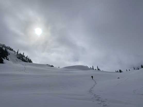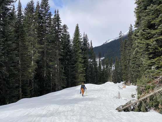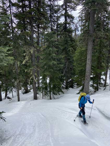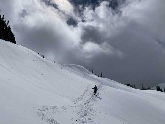 The weather had been cloudier than expected so I went for a leisure routine in the morning. Matt and Elise showed up earlier than I thought just as I finished cooking the Ramen breakfast. Thankfully Matt had some gear transition to do at the trail-head so I didn’t have to rush eating. We discussed pushing a little higher on the road in Matt’s truck but it’s clear that we wouldn’t be able to drive too much further. In fact, we could have saved 10 minutes of walking and that’s it. The snow on the road had undergone some decent overnight freeze and also packed hard by the snowmobiles. Matt opted to wear his ultra-light backpack that didn’t even have straps for his snowshoes, so he carried the snowshoes for a few kilometers up the road in his hand. Elise and I opted to strap the snowshoes on and sure enough, there’s one bare patch on the road on the first switchback. Feeling frustrated I just led us short-cutting this switchback through the bush. Matt somehow was waiting for us out of sight in the middle of that switchback bend but thankfully Twig found us. The elevation gain on this road was steady to around 1200 m where we were greeted by a kilometer of flat section, and after 7 km into the plod we reached the cut-block at the road’s end at 1400 m elevation. We had been plodding at a pace of 4.5 km/h and my legs were very tired.