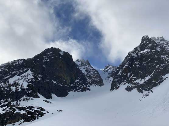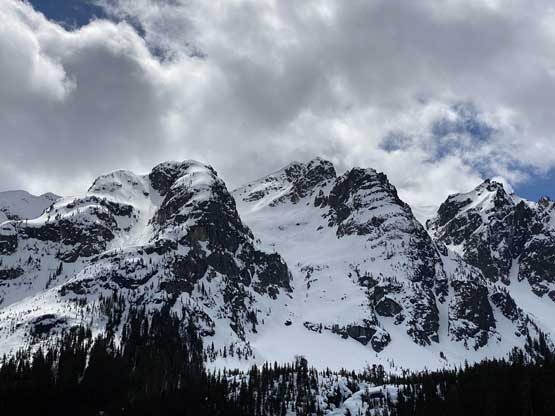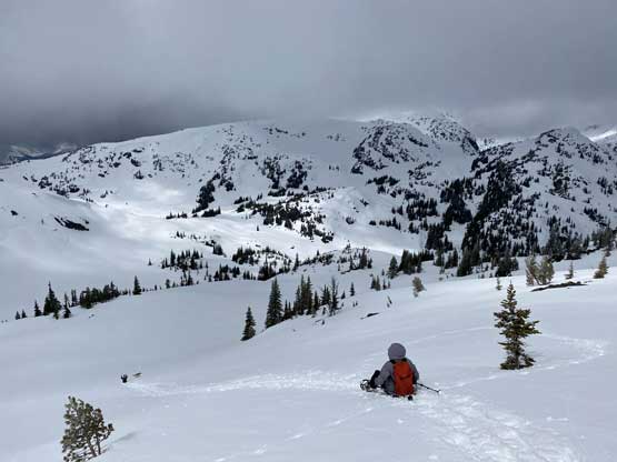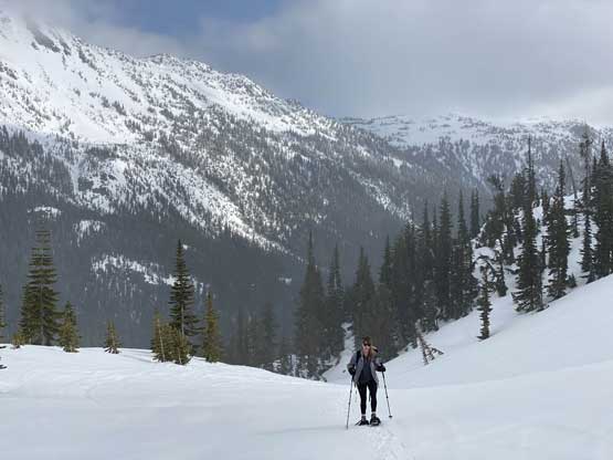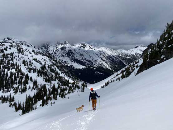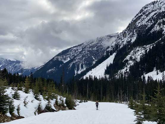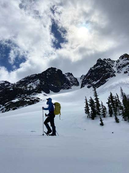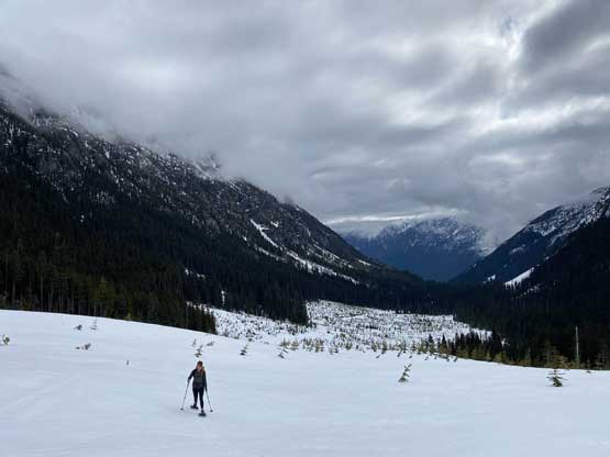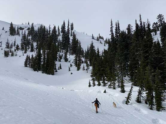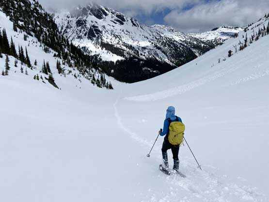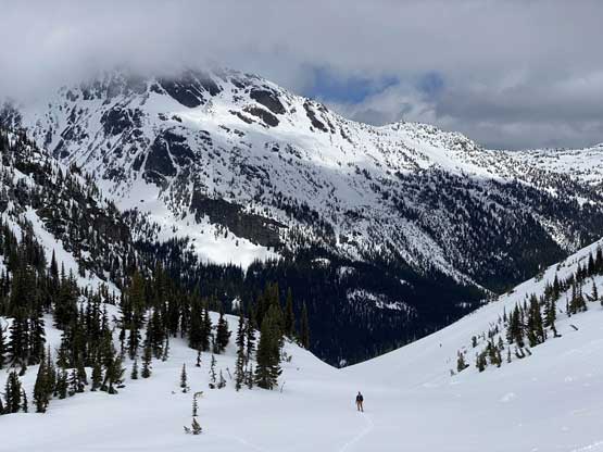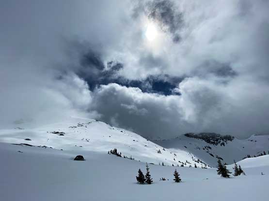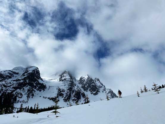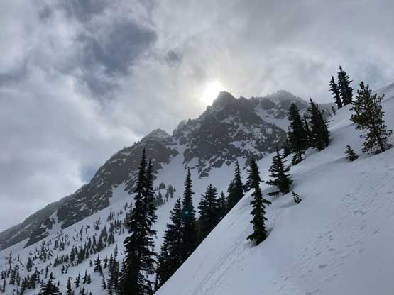 From the end of the road we found the snowmobile tracks continuing into the forest towards the base of Mt. Ronayne’s north face. We resisted the temptation to ascend higher and instead, traversed west into the obvious valley to the west of our objective. Ascending this valley was easier than I thought with mostly gentle terrain. The weather was unfortunately, much worse than forecasted that we even got hit by a couple snow squalls.