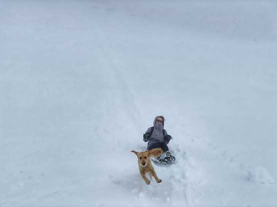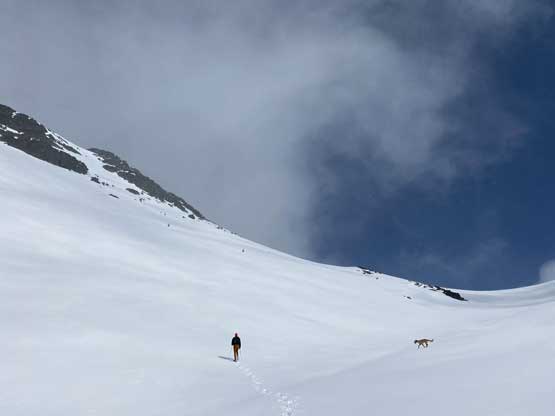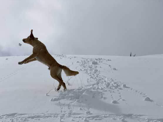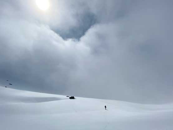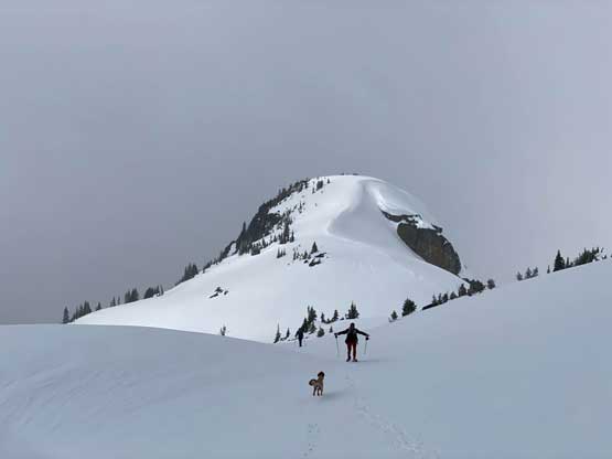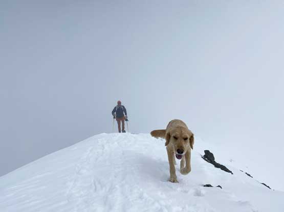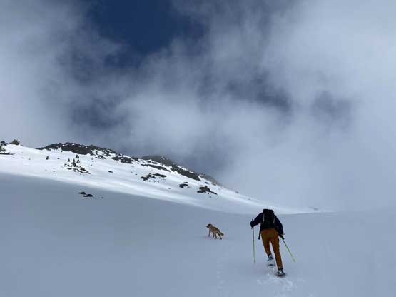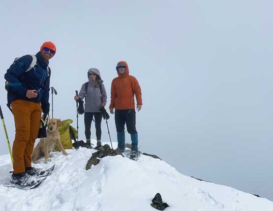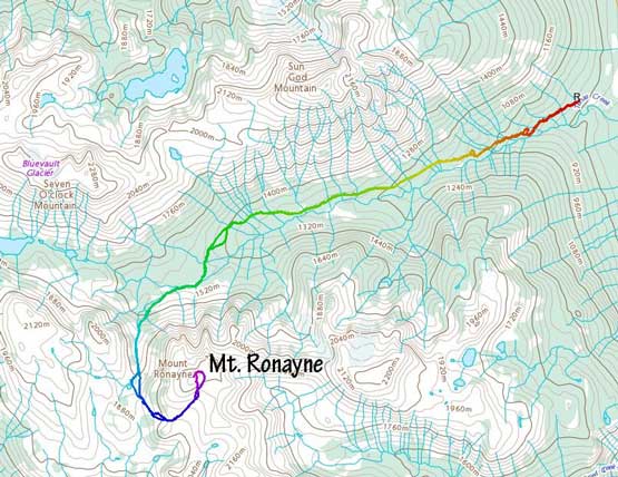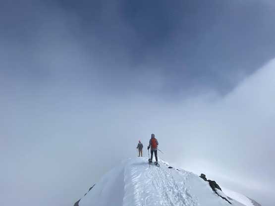 Higher up we veered left towards an obvious “col” on the SW Ridge of Mt. Ronayne. We thought about to ascend the steeper SW Ridge to the summit but the (faint) sled tracks continued wrapping around the peak to the gentle south slopes, so we just followed the tracks. Near the summit we entered a world of white-out and ascended a steeper route up the SE Face that involved some “technical snowshoeing” moves. The summit was cold so we couldn’t afford to linger too long. The weather did not show much of a sign of improving anyway.