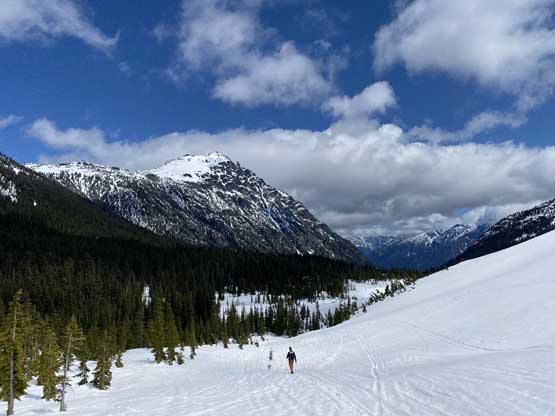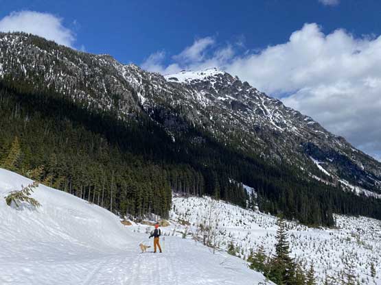 Mt. Ronayne boasts exactly 600 m of clean prominence and sits not far to the north of Pemberton. It has an impressive north face that drops 800 m down into the upper Tenas Creek drainage while a trail traverses reasonably close to its gentle south slopes from Fowl Lake and Owl Creek drainage. The “Y Couloir” on the north face is apparently a classic for the Pemberton-based skiers (especially with a sled-assisted approach) while I’m also sure the somewhat long and contrived trail system on the south side is often used by the local runners in summer. For peak-baggers seeking the most efficient way to tag this summit, the Tenas Creek approach to the west/south slopes had gained some attention in the recent years. The timing is a little tricky as there’s the balance between “having enough snow to cover the bush in the upper valley” vs. “having no snow on the forestry road to drive higher”.