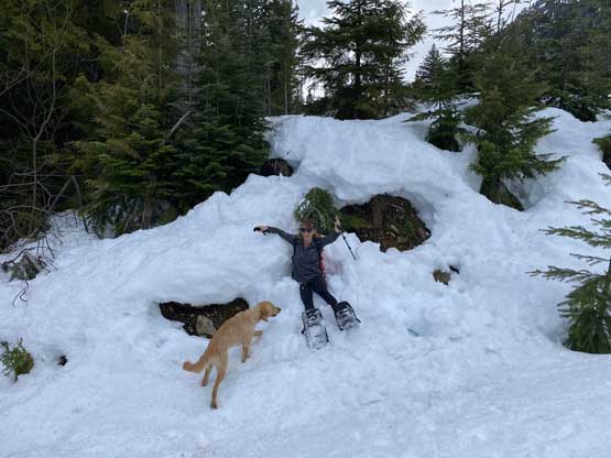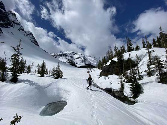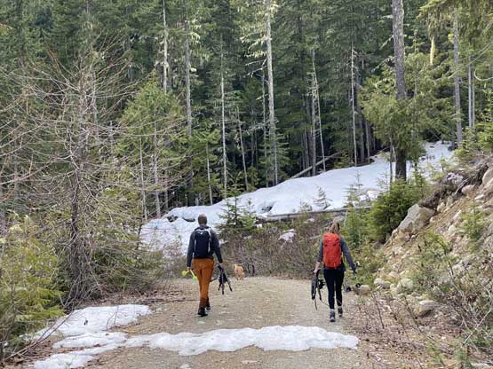 I drove out by myself the night before fearing the COVID road blocks set up by police in the Sea to Sky Corridor but such worrisome was proved unnecessary. None of us saw any police action other than a minor road construction near Furry Creek. The traffic at midnight was non-existing such that I had a cruise sail from White Rock all the way to Birkenhead River FSR. The going up the main FSR was as smooth as one could expect for SW BC standard. I was planning to sleep in my truck at the start of Tenas Creek FSR but the snowline was higher than I thought. I decided to drive up the spur road for as far as possible and it turned out that another 1.5 km was dispatched. I parked at 830 m elevation where I started to encounter large patches of snow. Speaking the timing we were here a little on the “early” side meaning that there’s definitely sufficient snow in the valley to cover the bushes but we had to deal with a longer walk.