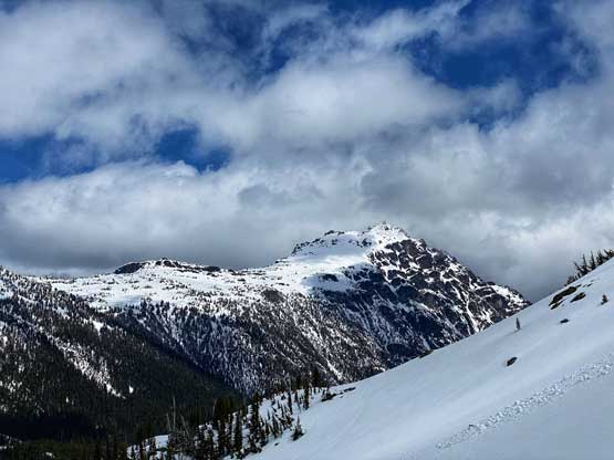 On the descent we went a short ways down the NE Ridge before dropping into the broad and gentle south slopes, much was done in the white-out. The clouds lifted as we wrapped around the SW Ridge to the west side of the peak with more and more blue skies showing up in the next couple hours. It seemed like we were about an hour too fast to reach the summit but oh well. On the descent we got some excellent views towards Sun God Mountain, another “P600m” objective in the immediate vicinity. The 7 km slog down Tenas Creek FSR was boring and tedious, but went by fast.