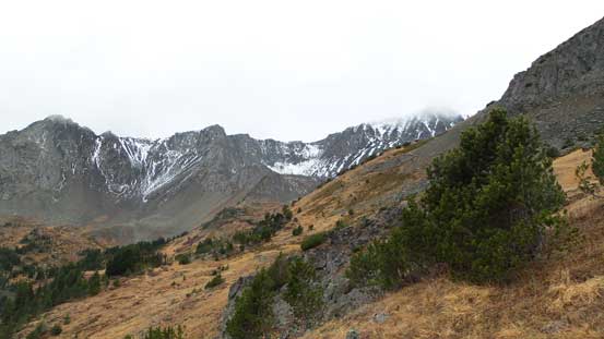 Now should I resume the direct traverse or come back down the same way to the lakes followed by re-ascending (scree bashing) to Saddlebag Peak? The latter option would no doubt be the most secure way despite the tremendous amount of height loss, but probably because of the shitty weather I felt like I had to make some exploration to make the long drive worth… The trip continues with an ascent of Saddlebag Peak and then Modal Peak.
