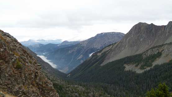 The next morning I woke up at 7:30 am under overcast sky with low clouds obscuring the peaks, and by 8 am I was on my way up the trail along north fork of Downton Creek. The trail was surprisingly well-marked by hundreds of flaggings and it’s almost impossible to get lost. It initially goes up the left side cut blocks to the end then traverses back into the drainage. There are a few places that the trail traversed through some boulder fields but even those sections were well marked by cairns. The only confusing spot was a wet section at roughly 2 km up. I made a mistake of crossing the creek but soon realized it and got back on track. Further up after the main creek forks into two the trail does cross one of them and then ascends the thinning forest. Into the sub-alpine I eventually lost the trail but then just picked my way up a steep foreshortened grassy gully, and then after traversing some open grassy plateau I arrived at Saddlebag Lakes immediately below my objective (2.5 hours from the start). The summit of Mt. Seton was engulfed and I took a break at the far end of these lakes.