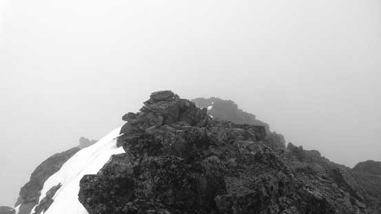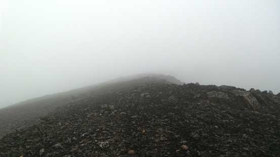 From the lakes to the summit was nothing more than a long plod (600+ meters of elevation gain). I basically went straight up but trending a bit to the right higher up. I utilized solid rock for as much as I could and in between those rock ribs were some treadmill scree… About halfway up I entered the cloud layer and then the rest of the ascent was done in a white-out. Higher up I pulled my GPS out to correctly locate where the true apex was as there seemed to have a bit of plateau to the left. I turned right and after another section of foreshortened slog I eventually made to the top. Unfortunately the weather would only get worse and now there’s some light drizzle coming down…