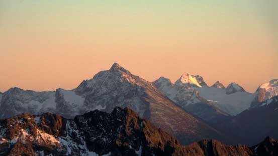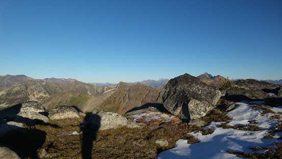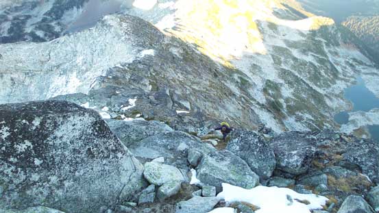 The E. Ridge looked like a “moderate scramble” with a bit route-finding here and there, and went exactly as predicted. There were a few trickier spots bypassible on the climber’s left side. We did so for a few and attacked head-on for another few. It didn’t take us long to arrive at the summit as we were basically bolting up the ridge for as fast as we could. We successfully beat the sunset time and looked like we even had a few extra minutes to hang around…