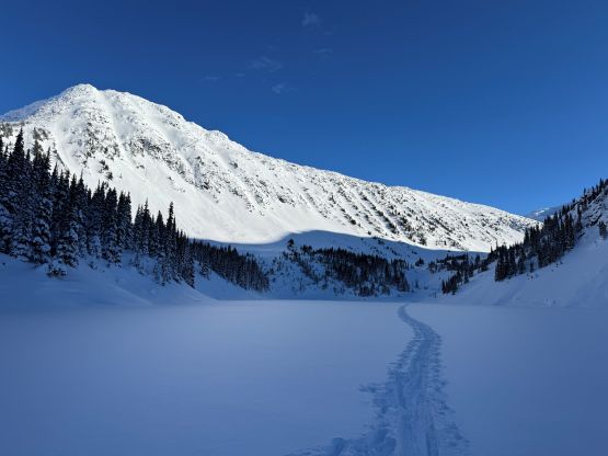 This was only my second time parking at the Marriott Basin trail-head. The first time was Mt. Rohr over 10 years ago, also in December. The approach was longer than what I remembered. It took us a while to plod to the official trail-head, and the route to Rohr Lake was also more complicated than I thought. The numerous sets of skin/snowshoe tracks made for a confusing maze. I made a mistake by not downloading my own GPX track so at one point I thought we were off-route veering too far climber’s left towards Wendy Thompson Hut. This was actually not the case but I made the call for us to make a cross-country traverse to the right. A while later we intersected a set of fresh skin/snowshoe tracks which we quickly discovered was made by Tareef and his partner. We caught up to Tareef on the boulder field immediately underneath Rohr Lake’s outflow. Tareef was on skis but his partner was snowshoeing while carrying the splitboards, said he wasn’t feeling comfortable to skin. That explained the meandering mix set of skin and snowshoe tracks. Tareef’s tracks converged with the main set of skin tracks and in short time we arrived at the frozen Rohr Lake. Plodding across the lake we quickly caught up to the next group of two skiers but then there was no more track to follow.