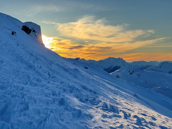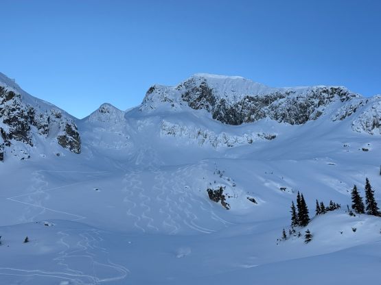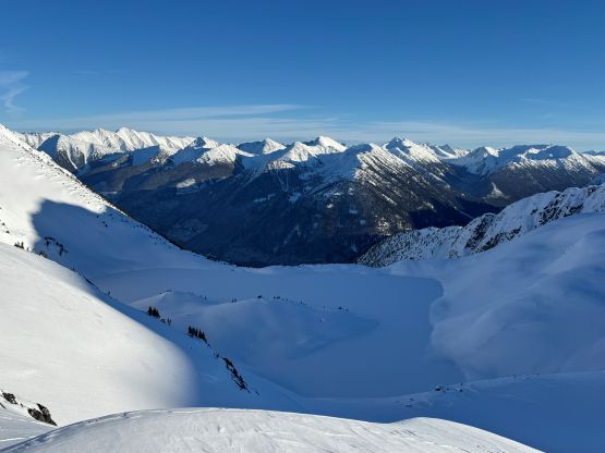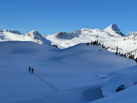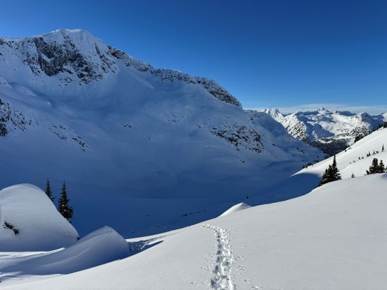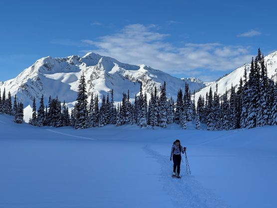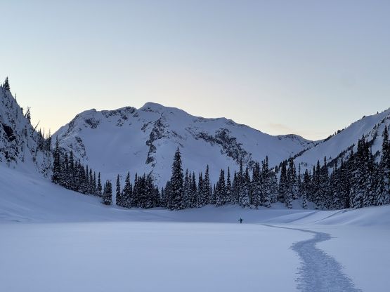 We again, opted to keep the snowshoes on and gingerly made our way down the steepest part of the ramp. It sure would be “better” to switch to bootpacking but we were too lazy to add the transitions. The re-ascent of Mt. Rohr’s north shoulder was a grunt but the traversing section was very scenic with the late afternoon sun. We would have at most half an hour’s daylight time left, so rushed our way back down to Rohr Lake. It appeared that “the other team” had descended the south face of Mt. Rohr as we could only spot Tareef’s team’s tracks, which were made by a mix of ski and snowboard tracks. The snowboard tracks quickly gave way to snowshoe tracks as the terrain became flatter and more undulating, so we knew that we would catch them up quickly. We sure did, near the outflow of Rohr Lake. We then rushed our way down the boulder field plunging down as much as untouched powder as we humanly could. The head-lamps were not turned on until the flats above the summer Marriott Basin trail-head. The final few kilometers of plodding felt like a drag, and our round trip time was just over 7 hours. Given that the BCMC’s group took 11 hours via their route, I would say that our way was definitely more efficient, despite being longer in distance.