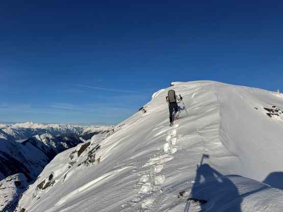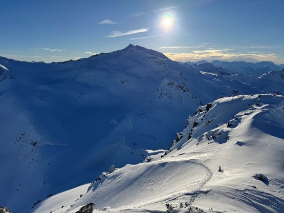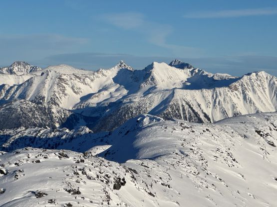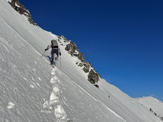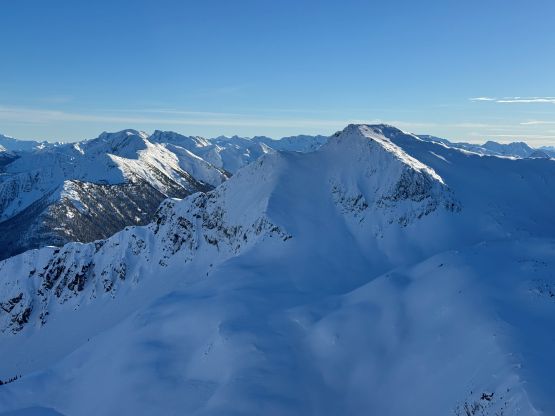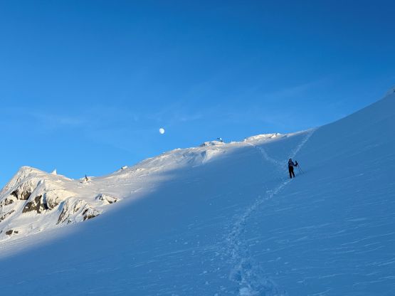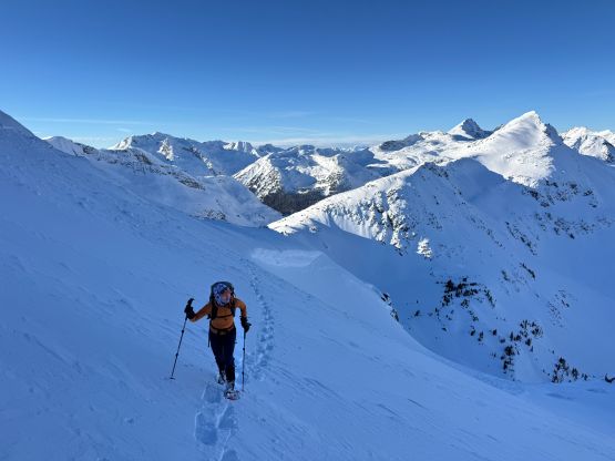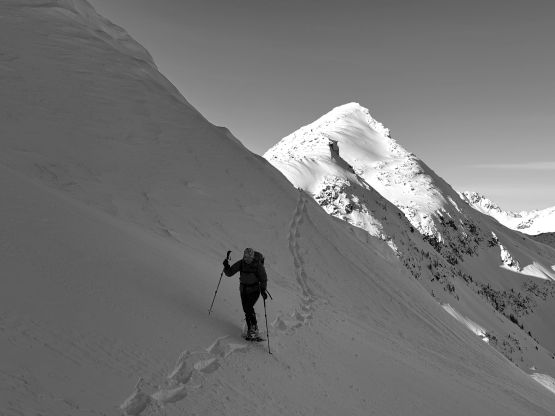 From the basin underneath Mt. Rohr and “Wonk Peak” we deviated from the standard Mt. Rohr’s route and went directly towards Rohr/Growl saddle where we took the first lengthy break of the day. There was some sunshine but the winds were sort of chill. We then ventured into the unknowns. The most certain way to access Rohr/Niche saddle was by dropping over 150 m elevation down to the NE but given the low/low/low avalanche forecast we decided to take a higher line traversing across the steep and complicated north slope of Mt. Rohr. This way requires about 150 m elevation gain and loss so effort wise the two options should be similar. Our route indeed involved a healthy load of traversing and definitely required the most stable conditions. We were able to keep the snowshoes on despite the slope angle approaching 40 degrees so the snow condition was basically optimal.