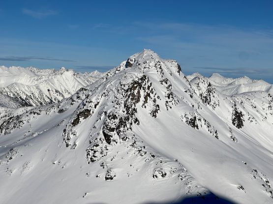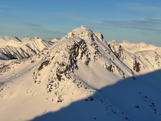 Hitting the high point on Mt. Rohr’s north spur I decided to stick to the ridge crest descending towards Rohr/Niche saddle, but such didn’t work out as planned. The terrain quickly became narrow and exposed, that even though it might work with ice axe and crampons I decided to turn around to try traversing down into and then across the south-east side bowl. I figured this would be faster overall. There’s one unnamed lake in that bowl, but we didn’t have to drop all the way down there. Instead we made another long and steep traverse across the south facing slope and eventually rejoined the ridgeline, which brought us down into Rohr/Niche saddle. From there we finally joined the BCMC’s route by traversing diagonally onto the south face ramp. The ramp appeared steep and it sure was, but given the soft condition we again managed to keep the snowshoes on for the entire way. The slope angle was about 40 degrees at the steepest. There was still fair amount of terrain to negotiate on the upper SW Ridge but nothing complicated, and we managed to reach the summit before the two other skiers’ teams topping out on Mt. Rohr.