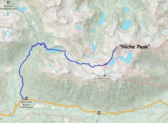 “Niche Peak” is one of the bivouac-named objectives in the vicinity of Mt. Rohr and Mt. Marriott that boasts over 100 m prominence. For almost 10 years I insisted to ignore these peaks because I absolutely hated these unofficial names. The reason is simple, as I simply do not believe that us peak-baggers have the “right” to name geological features without a complicated approval process by the government. There sure have a shit ton of peaks in this area (based on the 100 m prominence cut-off), but in my ideology they should only be referred by elevation or coordinates. However, these peaks are ascended more and more often these days, that these “bivouac names” are starting to stick at least on the online world, so I sort of have no other way but “accepting” them. Oh well…