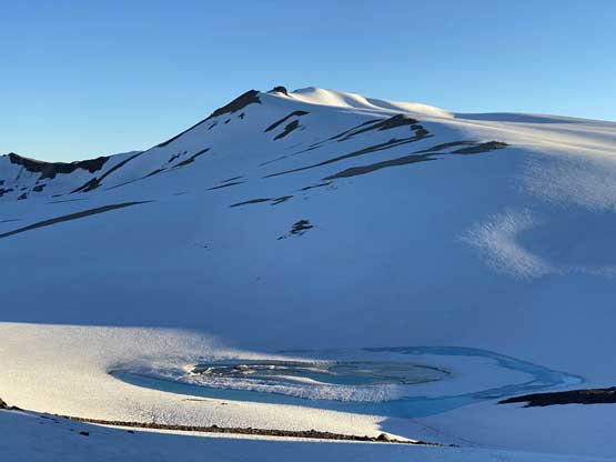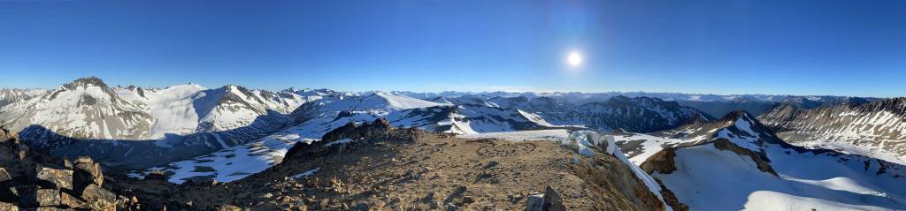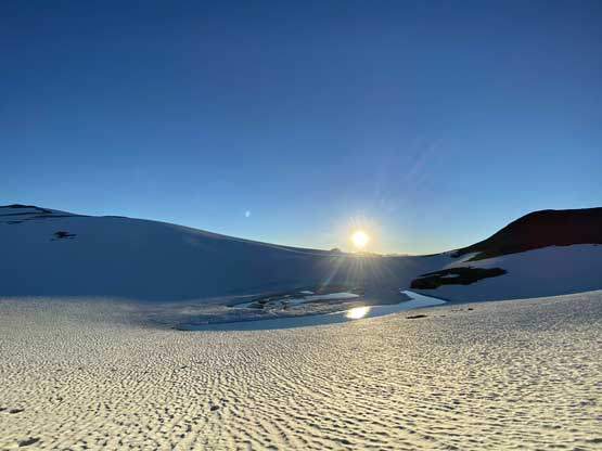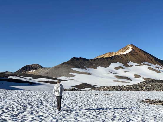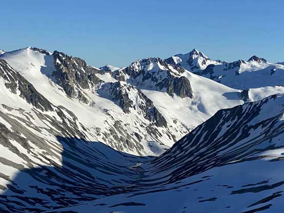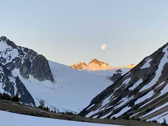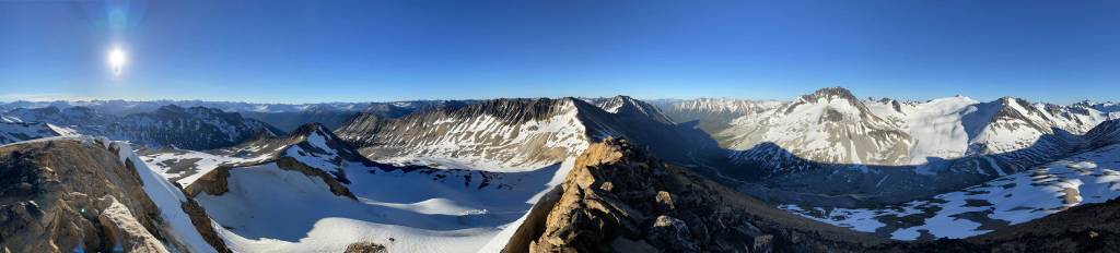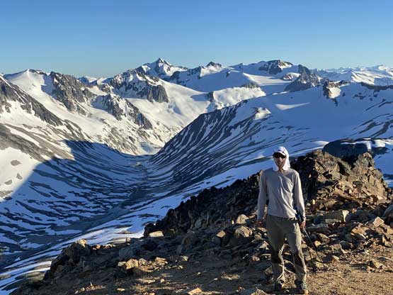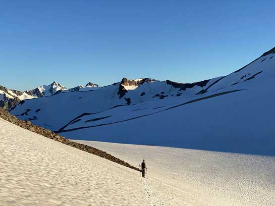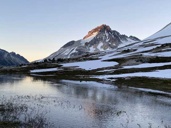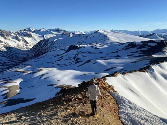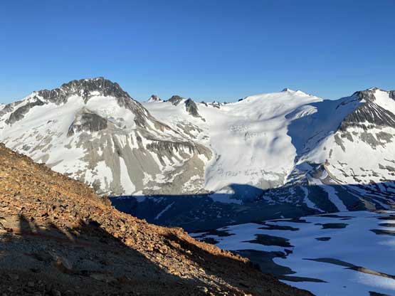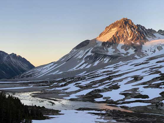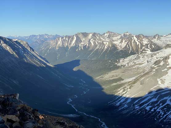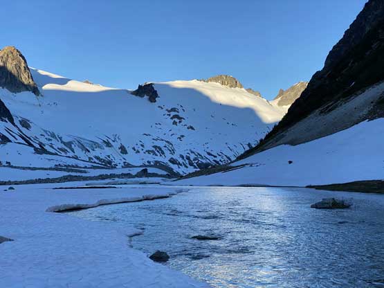 It was 8 pm when we summitted so we had a little over 1.5 hours to get down to camp before head-lamp time. The camp was still 5 km away but we figured it’s very possible to beat the darkness. Because we ditched the pack we must traverse back up and over those pinnacles (which again, was not too bad) and then dropped briefly down onto the tedious talus before merging onto continuous snow. We did have to re-ascend out of that basin to get back onto “The Elephant” ridge. I knew Sean had descended straight from the basin towards Athelney Pass but given the time of the day we decided to not fuck around with “other ideas” and simply retrace our own steps. There’s one long ass traverse followed before we could see our own foot prints. The rest of the descent back to camp was rather uneventful. That stream crossing near the end was just as deep as a few hours earlier and yes, we did get back before dark. We even earned enough time to cook dinner before having to use head-lamps.