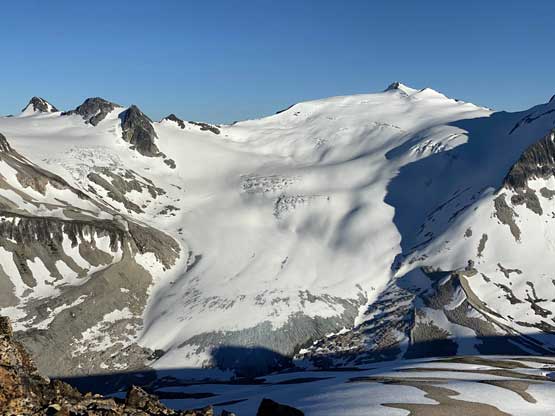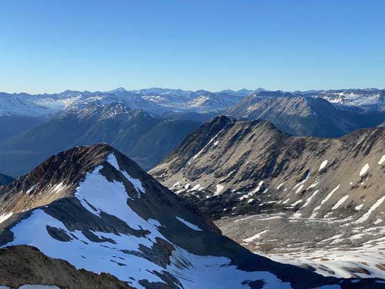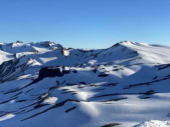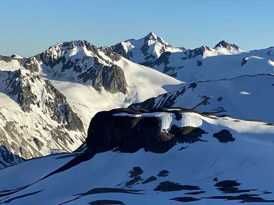 From the gentle ridge connecting with “The Elephant” we had to lose about 50 m elevation into the basin before slogging onto Ochre Mtn.’s W/SW Ridge. This basin was full of boulders in the summer but for us, it was a simple plod on snow. While grunting onto the Ochre’s ridge we started to post-hole seriously in isothermal and thin areas. The original plan was to traverse farther out on snow to bypass the scrambling on the west ridge but given the crappy snow we opted to use rocks. After hitting the west ridge of Ochre Mtn. we ditched the pack.